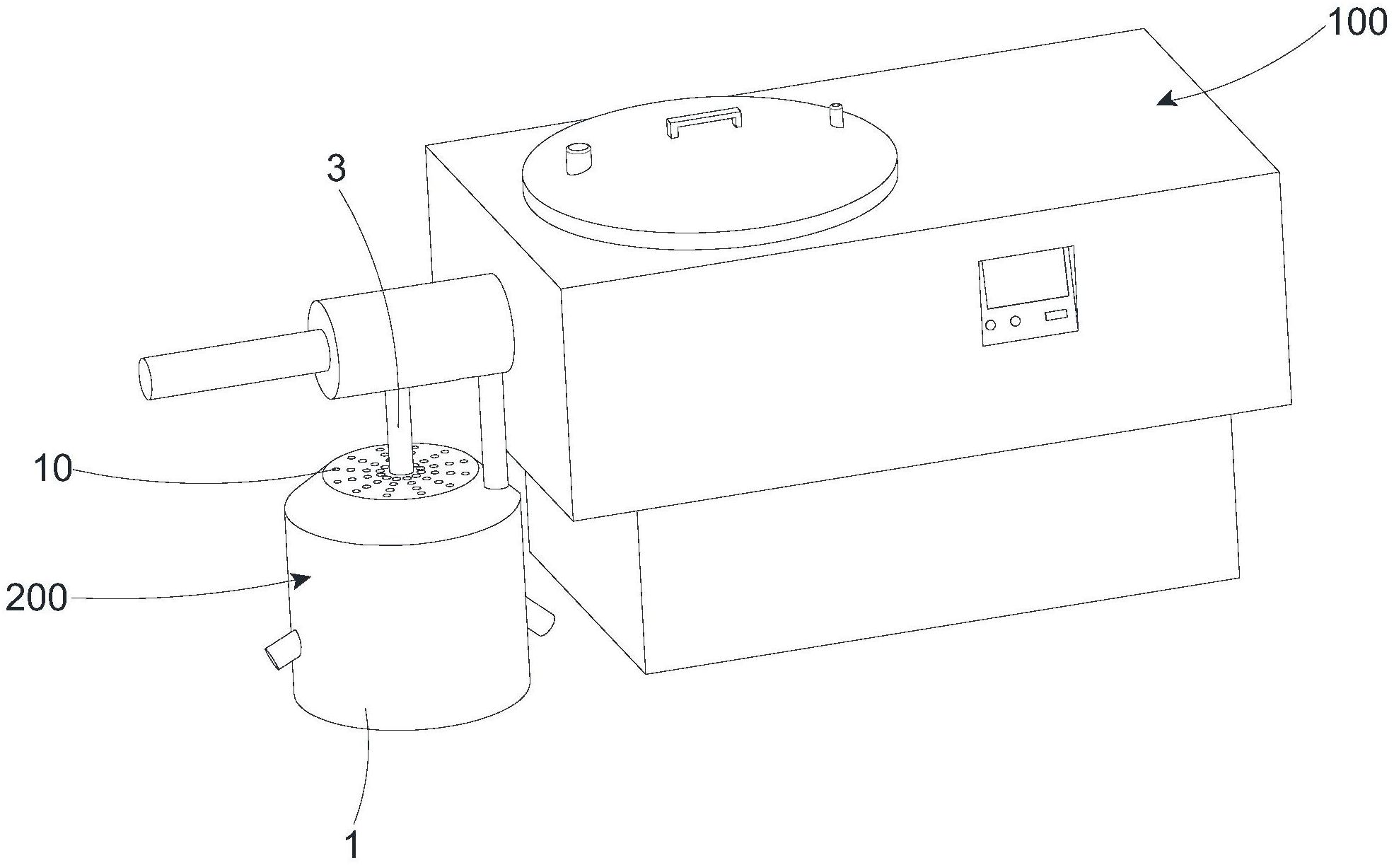 本实用新型提供一种带干燥器的湿法制粒机,包括湿法制粒机本体及干燥器,所述干燥器包括桶体及供风件,所述桶体与所述湿法制粒机本体的出口处通过管路连接,所述供风件设于所述桶体的底部,所述桶体沿高度方向螺旋设有导向通道且所述导向通道位于所述管路与所述供风件之间,所述导向通道的入口端与所述管路对应连通,所述导向通道的出口端与所述桶体的外部连通,所述桶体沿高度方向贯通设有若干串风孔且所述串风孔与所述导向通道连通,其能够直接对湿法制粒机本体排出的颗粒进行干燥,减少人力的输出,提高颗粒干燥效率。