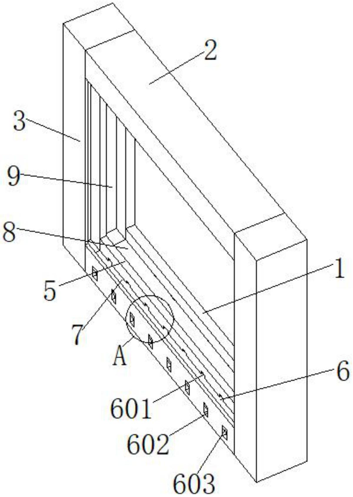 本实用新型公开了一种新型钙锌绿色环保的塑钢型材,包括第一基座与第二基座,所述第一基座与第二基座的两侧均连接有挡板,且所述第一基座位于第二基座下方且通过挡板组合成矩形结构,所述第一基座的内侧设置有可以便于安装门窗的拆装机构,所述第一基座的内侧设置有与第一基座活动连接的T形板,所述第一基座与T形板之间设置有可以导出雨水的导雨机构。本实用新型,通过设置的拆装机构可以使门窗的安装与拆卸更加便携,且还可以安装不同尺寸的门窗,避免出现在买门窗尺寸错误时还需要去更换门窗的现象,通过设置的导雨机构可以通过导雨孔将右槽的雨水通入左槽防止滑动门窗时将雨水渗透到房间内。