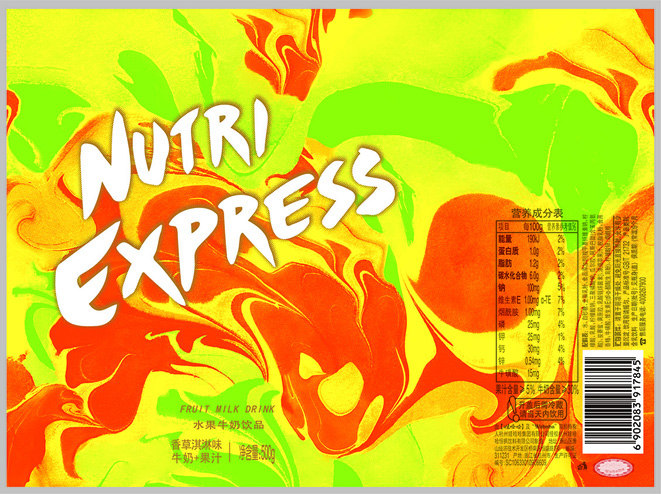 1.本外观设计产品的名称:标签(炫彩版营养快线香草淇淋味)。2.本外观设计产品的用途:用于饮料的包装容器上。3.本外观设计的设计要点:产品图案、色彩。4.最能表明设计要点的图片或者照片:主视图。5.省略视图:本外观产品的标签为平面设计且背面无设计内容,故省略其他视图。6.请求保护的外观设计包含色彩。