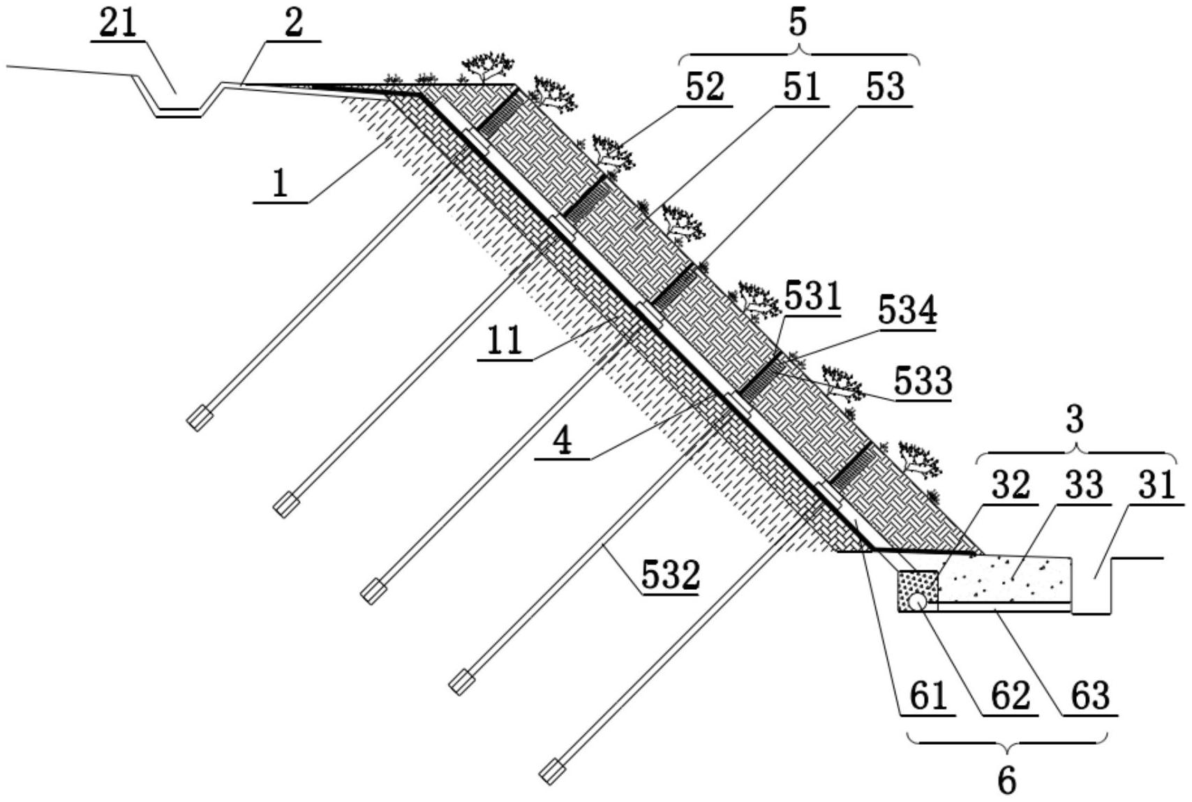 本实用新型属于边坡防护技术领域,公开了一种生态护坡,包括膨胀土边坡、坡顶防护台、坡脚防护台、高分子防水层、生态防护层和导水通道。其中,膨胀土边坡的表层通过土壤固化剂形成固化层,坡顶防护台设置于膨胀土边坡的坡顶,坡顶防护台上设置有坡顶截水沟,坡脚防护台设置于膨胀土边坡的坡脚,坡脚防护台上设置有坡脚排水沟,高分子防水层铺设于固化层的表面,生态防护层铺设于高分子防水层的表面,导水通道设置于生态防护层上,能够将坡顶截水沟中的水导向坡脚排水沟。本实用新型中,高分子防水层能够对膨胀土边坡进行可靠的保护,并能够缓冲释放膨胀土边坡变形所产生的应力。