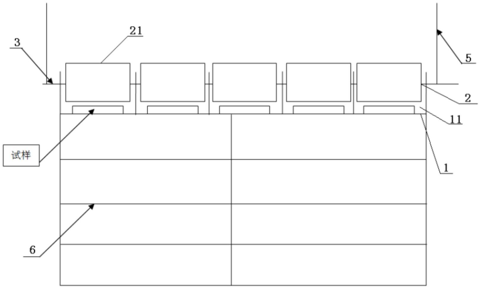 本实用新型公开了一种卷材持粘性检测和剥离试验样品制备装置,包括制样台、气缸和升降装置,所述制样台由若干个平行排列的制样槽组成,每个制样槽中对应设有压辊,若干压辊通过连接杆同轴连接组成压辊组;所述气缸的活塞杆与连接杆连接,带动压辊组滚动;所述升降装置包括两个链条带和高度调节机构,所述链条带一端与高度调节机构连接,一端与压辊组两端的连接杆套接,通过高度调节机构带动压辊组在高度方向位移。本实用新型结构简单,操作方便,可保证制样全程压辊施加的力值和滚速相等,提高制样的稳定性,能够更准确地检测到产品的真实粘接性能数据;可同时实现多组试样的制作,工作效率高,可实现多个试样的批量化制作,值得推广。