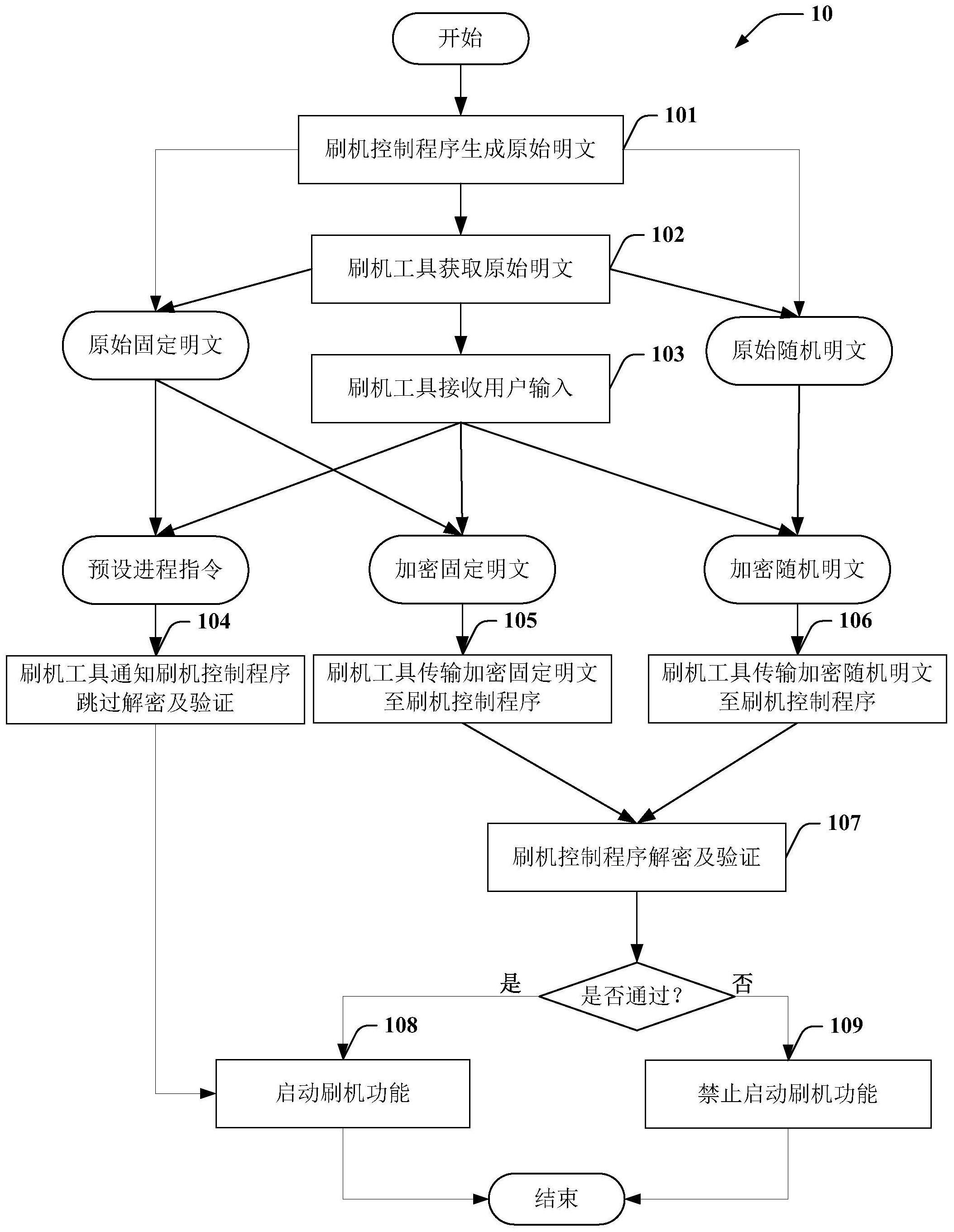 本发明提供了一种移动设备的刷机控制方法,包括以下步骤:在移动设备的刷机控制程序中生成原始明文,原始明文为原始固定明文或原始随机明文;刷机工具从刷机控制程序获取原始明文,并且刷机工具接收用户输入,当获取的原始明文是原始固定明文且用户输入是预设进程指令时,通知刷机控制程序跳过解密及验证,启动刷机工具的刷机功能;当获取的原始明文是原始随机明文且用户输入是加密随机明文时,将加密随机明文传输给刷机控制程序,刷机控制程序对加密随机明文进行解密及验证,当验证通过时启动刷机工具的刷机功能,当验证不通过则禁止启动刷机工具的刷机功能。
