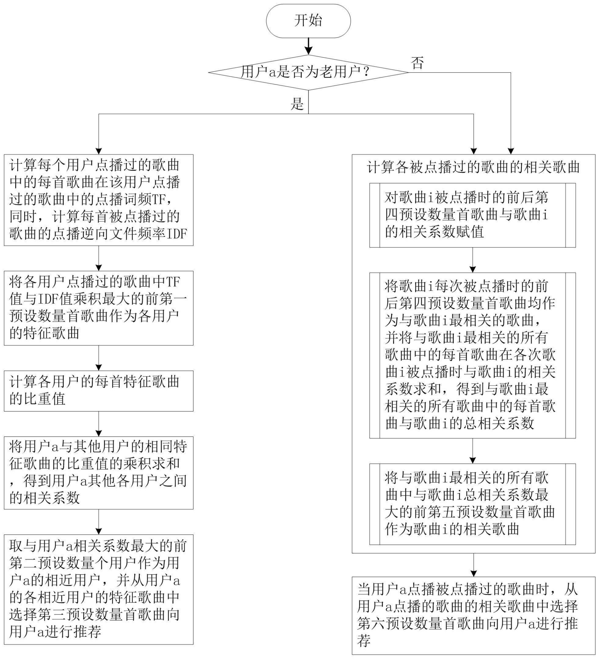 本发明公开了一种基于类指数分布和TF‑IDF特征的歌曲推荐方法、介质和装置,通过引入TF‑IDF统计算法,计算用户的特征歌曲,而不再使用所有的歌曲进行计算,大幅度减小了计算量。同时,通过改进现有的皮尔逊有关系数的计算,不再依赖于所有歌曲的频率计算,而是依据特征歌曲的单独概率计算,选出相似用户,也大幅减小了计算量,加快了计算速度,同时确保了歌曲推荐的准确性没有明显下降。