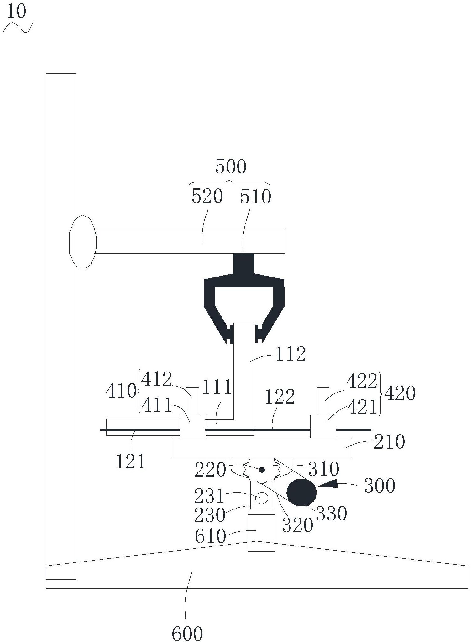 本实用新型涉及一种介入器械抗撕裂性检测装置,包括旋转平台、用于驱动旋转平台绕一转动轴的中心轴线转动的驱动件、夹持机构及拉升机构,夹持机构包括设置于旋转平台的用于紧固第一段及容置部的第一固定夹及用于紧固第二段及自由部中的之一的第二固定夹;拉升机构包括夹爪及用于带动夹爪往复移动的升降组件,夹爪用于紧固第二段及自由部中的另一。本实用新型通过设置夹持机构,可将第一段、容置部及第二段及自由部中的之一固定;通过设置升降组件,可带动夹爪向上移动,从而实现检测导丝口的抗撕裂性能,且通过设置旋转平台及可带动旋转平台转动的驱动件,以实现调整导管与导丝之间的夹角,从而实现检测导管与导丝不同角度下导丝口的抗撕裂性能。