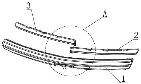 本实用新型公开了一种车灯分段式内透镜组合结构,涉及车灯技术领域,包括外壳,外壳的后方固定安装有主透镜条和副透镜条,主透镜条与副透镜条对立的端头设有胀紧孔,副透镜条与主透镜条对立端头设有凸边,凸边的下端设有连接固定孔,凸边可安装在主透镜条的端头内,外壳的后方中间处设有中部螺丝孔柱并且穿过胀紧孔,螺丝孔柱内安装有固定螺丝穿过连接固定孔将两个透镜条连接固定在外壳上。本实用新型采用两段式设计,中间通过胀紧孔、凸边和连接固定孔进行对接,组合后的稳定性突出,并且不影响透光性,外观显示效果良好,没有中断点,非常适合类似的车灯使用,并且成本低,注塑废品率低,多点螺丝固定,非常稳固定,适合推广使用。