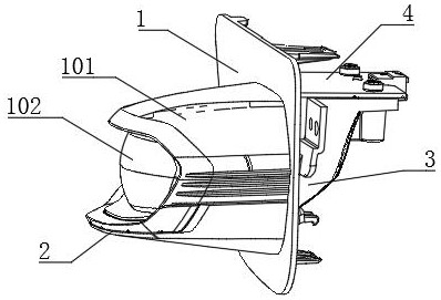 本实用新型公开了一种近光灯模块安装结构,涉及车灯技术领域,包括黑色部分的装饰框和外壳中间的透明壳,外壳的左侧下端固定安装有嵌框,外壳的右侧设有反光罩,反光罩的上端通过固定螺丝安装有电路板,外壳的右侧上下端分别设有上端卡扣和下端卡扣。本实用新型设计分离式的嵌框,方便镀铝加工,外壳上设有上下卡扣、长条槽和限位槽,反光罩上设有倒钩、限位柱和固定侧板,各个结构都是为了提高稳定性,方便快速安装的要求,这样可以减少组装时间,节省成本,采用高亮黑反光罩,与外壳周围的颜色相同,可提高美观性,整体设计合理,简便快捷。