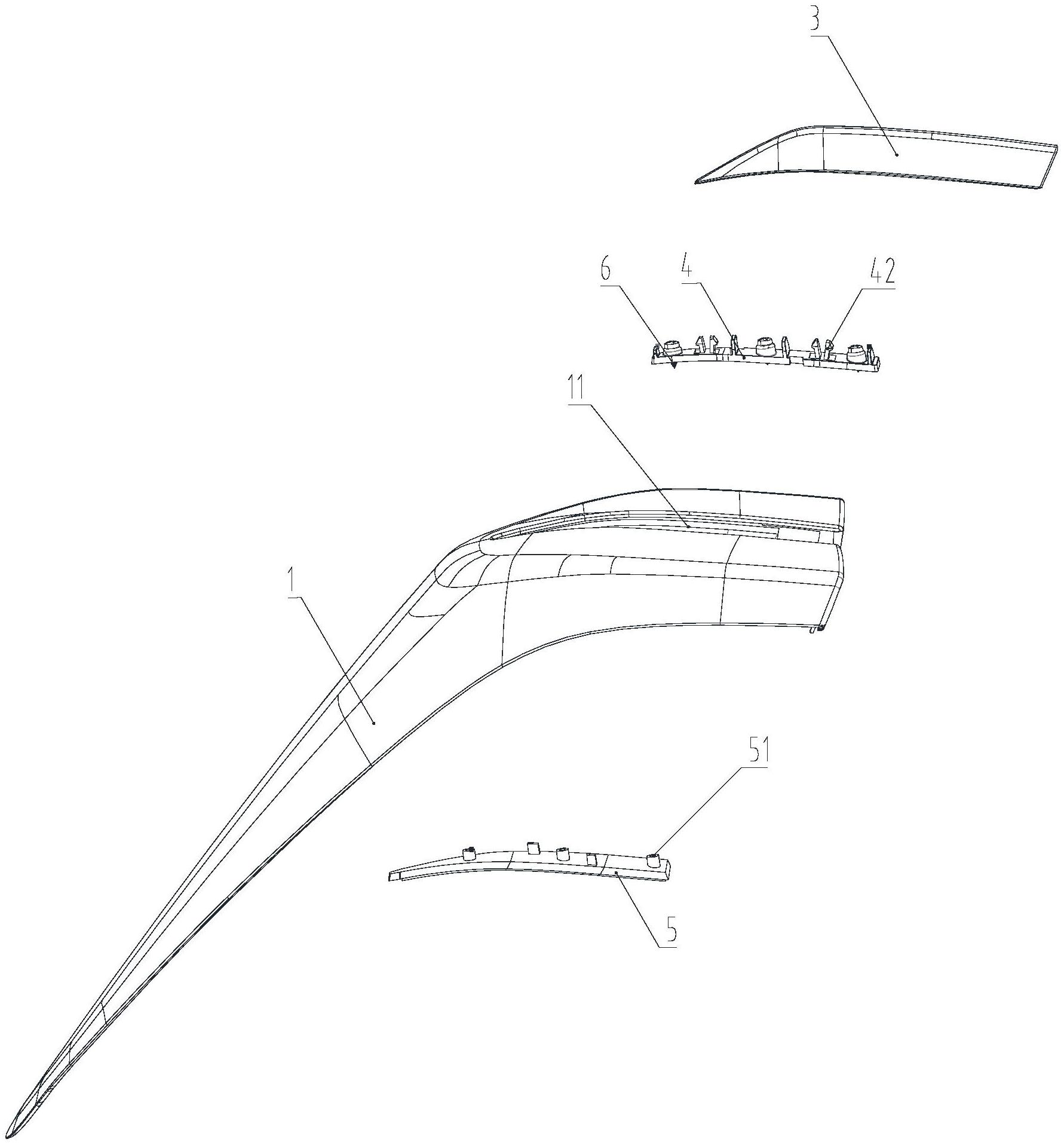 本实用新型公开了一种汽车尾灯及其饰条安装结构,包括PMMA材质的灯罩、饰条、第一基板和第二基板,所述灯罩上设有一用于安装饰条的条形槽;所述条形槽的底部壁上设有一安装长孔,所述第一基板位于灯罩的内侧并且第一基板的部分结构伸入安装长孔并与位于灯罩外侧的第二基板固定连接,所述饰条通过卡扣结构安装在第二基板上;其中,所述第一基板具有与灯罩内表面相抵的第一表面,所述第二基板具有与灯罩外表面相抵的第二表面;本技术方案中饰条能够稳固的安装在PMMA材料的灯罩上,以节约成本,并避免打螺钉出现灯罩开裂。