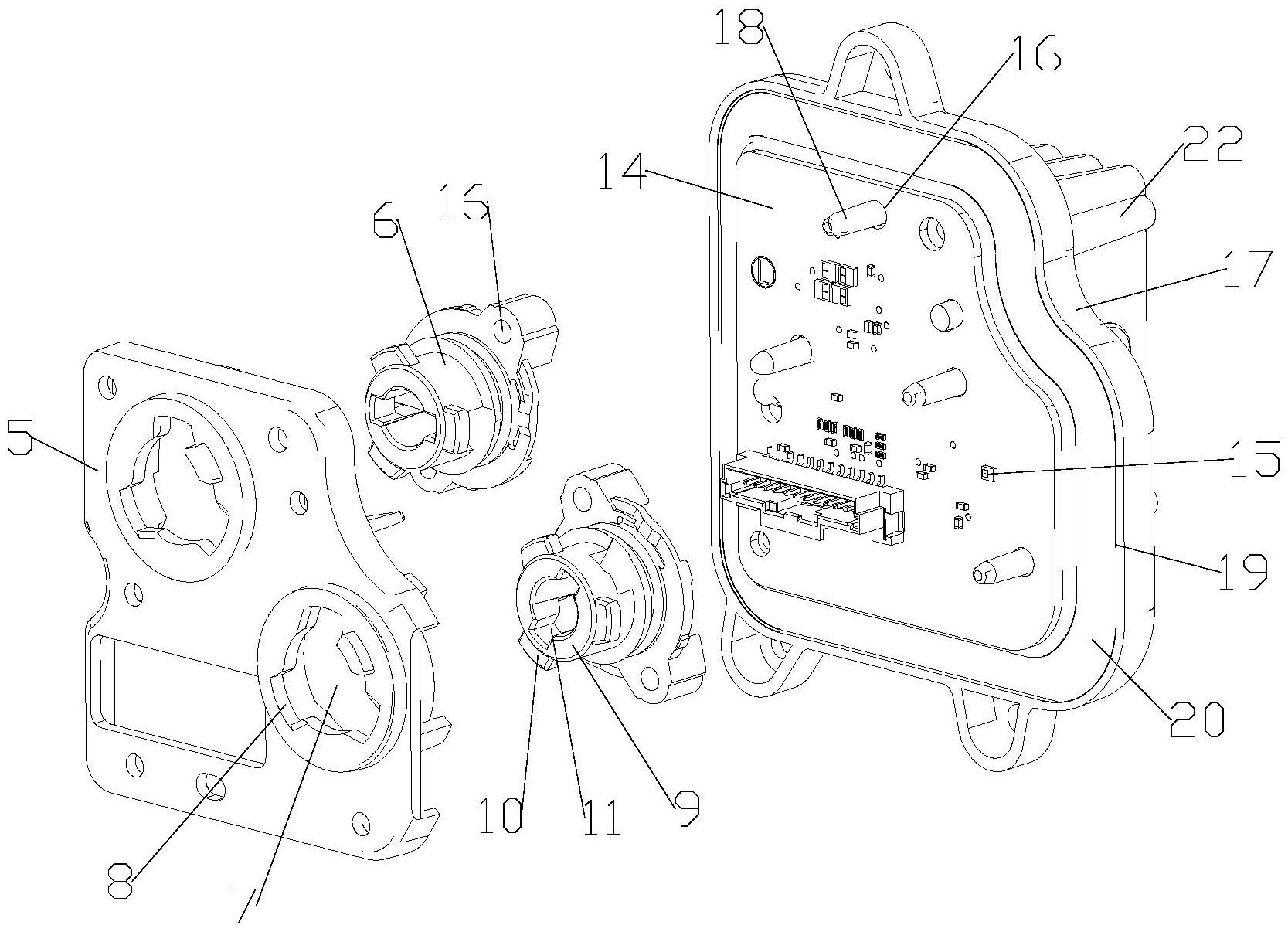 一种新型灯壳定位结构,包括灯壳、安装在灯壳上的灯罩和安装在灯罩上的光导条,光导条一端穿过灯壳设置,灯壳内侧开有用于穿过光导条设置的通孔,灯壳后端安装有位于通孔内的灯体盖板,灯体盖板内侧卡接有安装在光导条外侧对光导条进行定位的旋转卡扣,通孔可以扩大设置,在安装时首先使得带有光导条的灯罩安装在灯壳外侧,光导条则可以自然的伸入通孔内而避免灯罩与灯壳装配时光导条顶住灯壳,从而满足灯罩的机械化安装,在灯罩安装完成后再人工将灯体盖板和安装在通孔内,将旋转卡扣安装在光导条外侧,在使得旋转卡扣余灯体盖板卡接,进而对光导条进行限位,完成对光导条的定位安装。