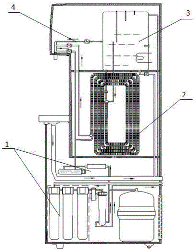 本实用新型涉及一种基于步进式逆流强化换热控制的温开饮水设备,属于饮水机温度控制技术领域。本实用新型包括净水器、热交换器、加热器、阀门总成和控制器,其中:净水器包括依次连接的前置过滤器、RO膜、后置过滤器以及UV灯;热交换器包括与净水器相连的常温供水口、与加热器相连的交换口Ⅰ和交换口Ⅱ;加热器包括加热管、传感器,以及若干水位电极;阀门总成包括与净水器相连的直饮水出口、与加热器相连的沸水出口,以及变温水出口。本实用新型结构精简且布局合理,可同时提供直饮水、变温水、沸水,使得供水温度多样化。