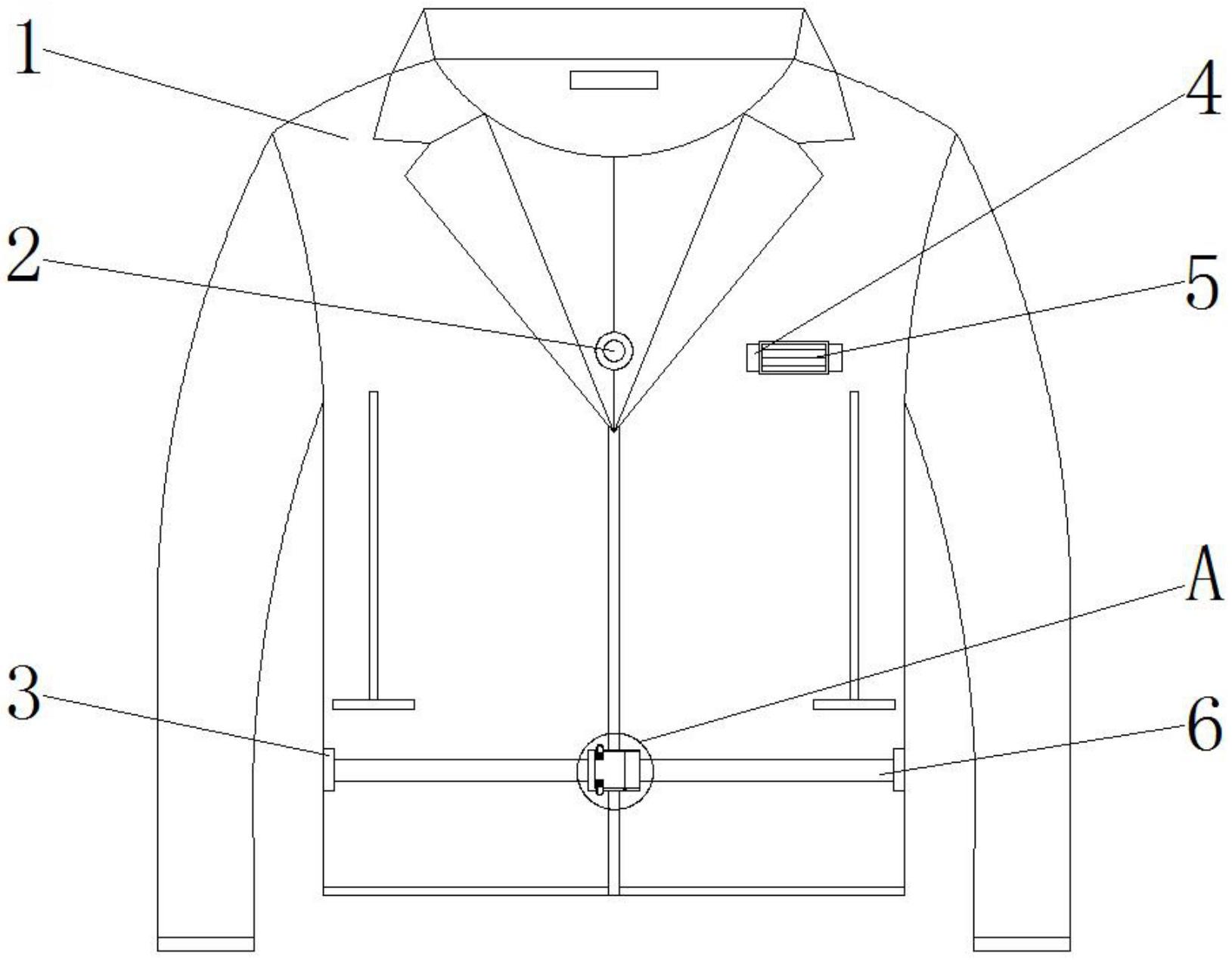 本实用新型公开了一种复合纤维服装面料的衣服,包括衣服本体,所述衣服本体的表面活动连接有钮扣,所述钮扣的一侧活动连接有限位组件,所述限位组件的表面活动连接有徽章,所述徽章的底部固定设置有限位环。本实用新型通过在钮扣的一侧活动连接有限位组件,当需要佩戴徽章时,此时推动推板,推板移动带动第一滑槽内的第一滑块移动,第一滑块移动带动第二限位板移动,接着将徽章的别针穿过第一限位板和第二限位板之间的限位孔,接着利用第一弹簧的回复性,推动第二限位板与第一限位板从新契合,对别针进行限位,解决了传统的徽章通常采用别针直接固定在衣服上面,而每次佩戴完成后都会留下两个小孔,影响衣服美观的问题。
