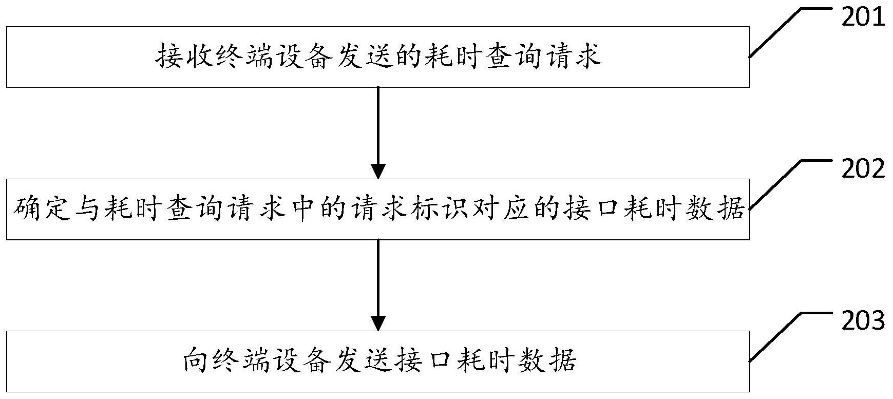 本公开是关于一种接口耗时数据处理方法,该方法包括:接收终端设备发送的耗时查询请求,所述耗时查询请求用于查询目标数据请求的接口耗时,所述耗时查询请求包含所述目标数据请求对应的请求标识,不同的数据请求对应的请求标识不同;确定与所述请求标识对应的接口耗时数据;向所述终端设备发送所述接口耗时数据,以使得所述终端设备根据所述接口耗时数据向用户显示所述目标数据请求对应的接口耗时。本公开提供的方案,能降低接口耗时调试的复杂度和系统风险。