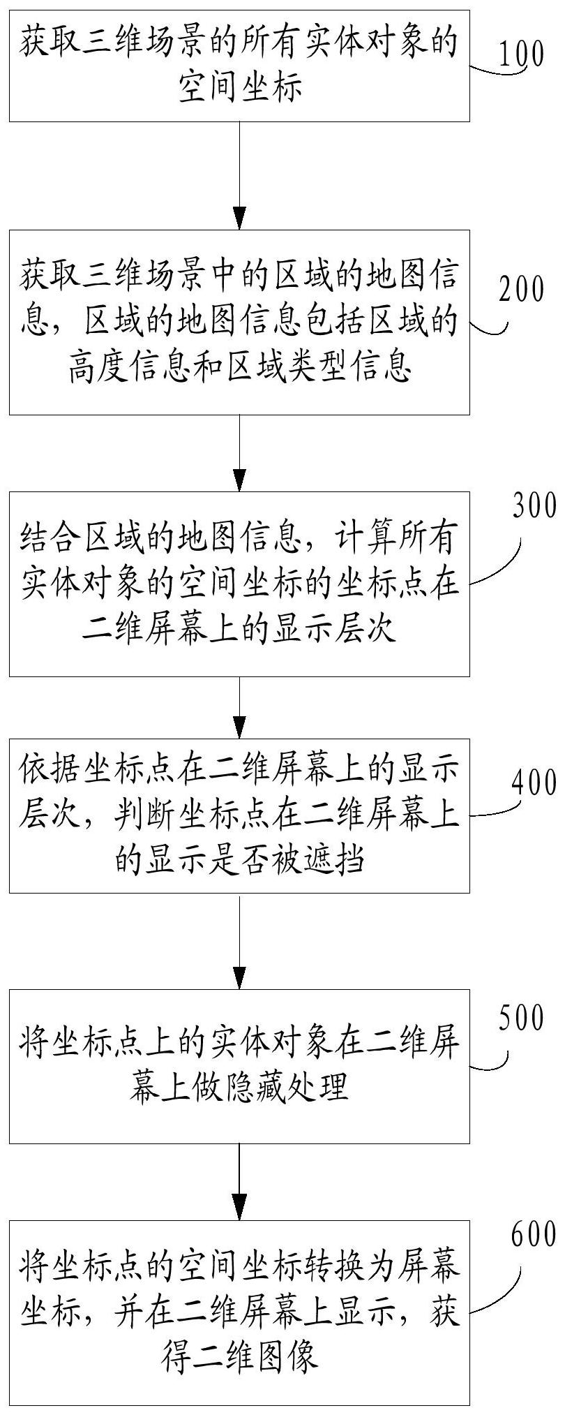 本申请属于场景转换技术领域,特别是涉及一种场景转换方法,用于将三维场景转换为二维图像,所述方法包括:获取三维场景的所有实体对象的空间坐标;获取三维场景中的区域的地图信息,区域的地图信息包括区域的高度信息和区域类型信息;结合区域的地图信息,计算所有实体对象的空间坐标的坐标点在二维屏幕上的显示层次;依据坐标点在二维屏幕上的显示层次,判断坐标点在二维屏幕上的显示是否被遮挡;若是,将坐标点上的所述实体对象在二维屏幕上做隐藏处理;若否,将坐标点的空间坐标转换为屏幕坐标,并在二维屏幕上显示,获得二维图像。在将三维场景转换为二维图像时,可以提高精度和确保层次的遮罩效果。
