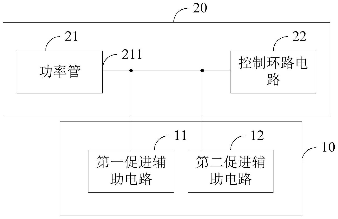 本发明公开了一种射频功放电路及其输出功率开关控制电路、控制方法,该输出功率开关控制电路包括:第一促进辅助电路,耦接至射频功放电路功率管的控制端,用于在功率管打开信号的上升沿的至少初始阶段,提供辅助正向信号,使得上升沿的至少初始阶段加速爬升;和/或第二促进辅助电路,耦接至射频功放电路功率管的控制端,用于在功率管关闭信号的下降沿的至少初始阶段,提供辅助反向信号,使得下降沿的至少初始阶段加速下降。本发明能够提升射频功放电路的性能,降低成本。