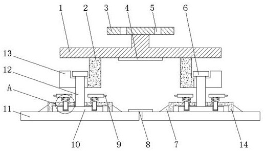 本实用新型提供一种外墙铝单板安装结构,包括安装板,所述安装板的上表面开设有两组安装孔,所述安装板的底面固定连接有连接板,所述连接板的底面固定连接有两个U型板,两个所述U型板相互远离的一侧面均开设有两个卡槽。该外墙铝单板安装结构通过拉簧和滑杆的配合,可以使滑杆能够上升移动,从而能够对安装块进行定位,以便于工作人员在安装或拆除安装块时快速,并且通过卡槽和插板的配合可以使卡板能够将铝单板本体进行支撑,防止铝单板本体在使用时出现滑动以及摆动,并且通过推动插板可以使卡板能够快速从U型板的内部移出,从而便于进行拆卸,解决了在对铝单板进行拆装时需要使用到各种工具,以至于工作人员工作效率较低的问题。