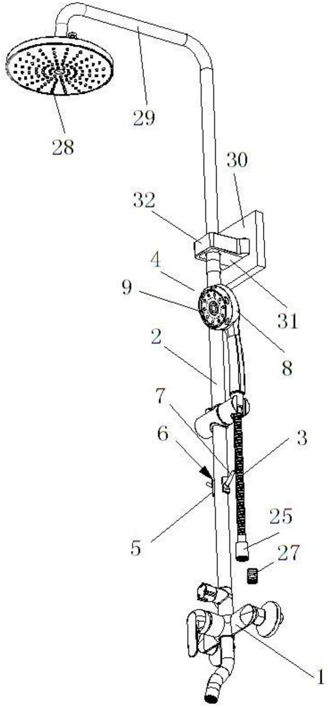 本实用新型涉及沐浴设备,公开了一种沐浴柱,包括水管座、手持软管、手持花洒,手持软管两端均通过接头组件分别与手持花洒、水管座连接,接头组件包括内环和外环,手持软管通过紧固环紧套在内环外,内环上向外凸设有卡环,外环内具有与卡环配合的阶梯孔,阶梯孔前部与内环的卡环卡接,接头组件与手持软管的连接处外套设有的连接套,连接套与手持花洒或水管座螺纹连接。本实用新型手持软管与内环通过紧固环紧固,并通过连接套与手持花洒或水管座连接,连接套与外环相对固定连接,内环与外环可相对旋转,实现手持软管与手持花洒或水管座之间的可相对旋转。