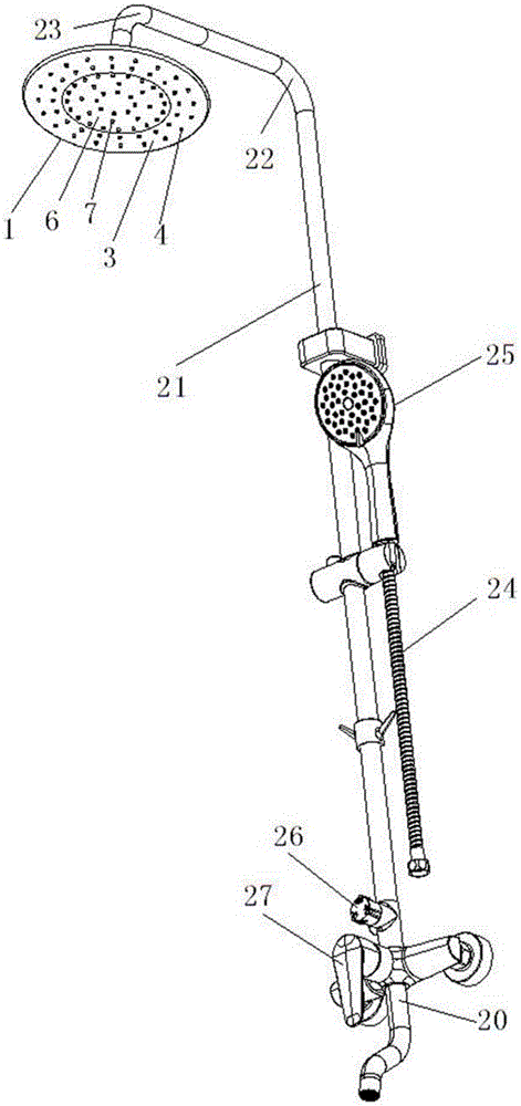 本实用新型涉及卫浴设备,公开了一种可泡泡浴的沐浴柱,包括顶喷花洒,顶喷花洒内设有一环状的水道,顶喷花洒上设有一环状的喷水罩,喷水罩上设有出水孔,顶喷花洒中部设有用于放置沐浴露的圆柱形的腔室,腔室通过一可拆卸面板盖住,面板上设有复数个出液孔,面板内端向内延伸有裙边,面板与腔室螺纹连接,裙边外围设有贯穿裙边径向方向的通槽,腔室内壁下部设有复数个通孔,通孔经通槽连通水道与腔室。本实用新型顶喷花洒内设置有用于放置沐浴露,通过旋转面板来对沐浴露选择性使用,实现泡泡浴和清水浴的切换,增加了顶喷花洒的功能,增强沐浴的乐趣。