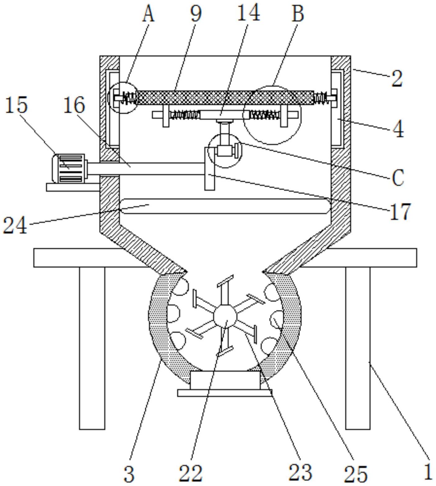 本实用新型涉及贝壳粉涂料生产技术领域,且公开了一种贝壳粉涂料生产用分层烘干机,包括两个支撑架,两个所述支撑架相对的一侧固定连接有烘干箱,所述烘干箱的底部连通有烘干筒,所述烘干箱的内部两侧均开设有限位滑槽,两个所述限位滑槽的内部均滑动连接有限位滑块,两个所述限位滑块相对的一侧均开设有卡槽,两个所述卡槽的内部均卡接有第一伸缩杆,两个所述第一伸缩杆的外表面均套设有第一弹簧。该贝壳粉涂料生产用分层烘干机,通过设置烘干箱,将贝壳粉涂料投放到烘干箱内的筛网上,筛网将贝壳粉涂料筛分后再经过第一加热棒落入到烘干筒内,经筛网筛分后的贝壳粉涂料与第一电加热棒接触的更充分,使得贝壳粉涂料受热均匀。