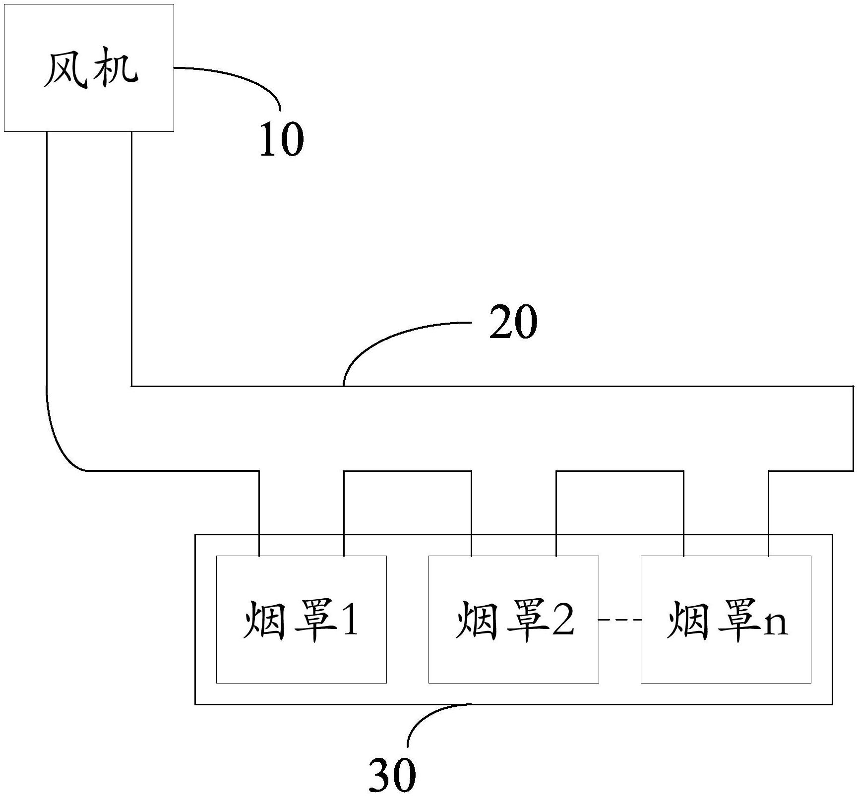 本实用新型公开一种多级联动变频风量控制装置,多级联动变频风量控制装置包括排烟通道、与排烟通道分别连通的多个烟罩及控制装置,排烟通道内设置有风机。烟罩包括微处理器、数字风阀和烟雾传感器,烟雾传感器检测其所在烟罩的烟雾量。控制装置根据烟雾量确定风机的转速以及数字风阀需要打开的角度。微处理器根据数字风阀需要打开的角度控制数字风阀的工作,以及根据风机的转速控制风机工作,以控制风机的风量。本实用新型用于解决多台油烟机并联使用耗电量较大的技术问题。