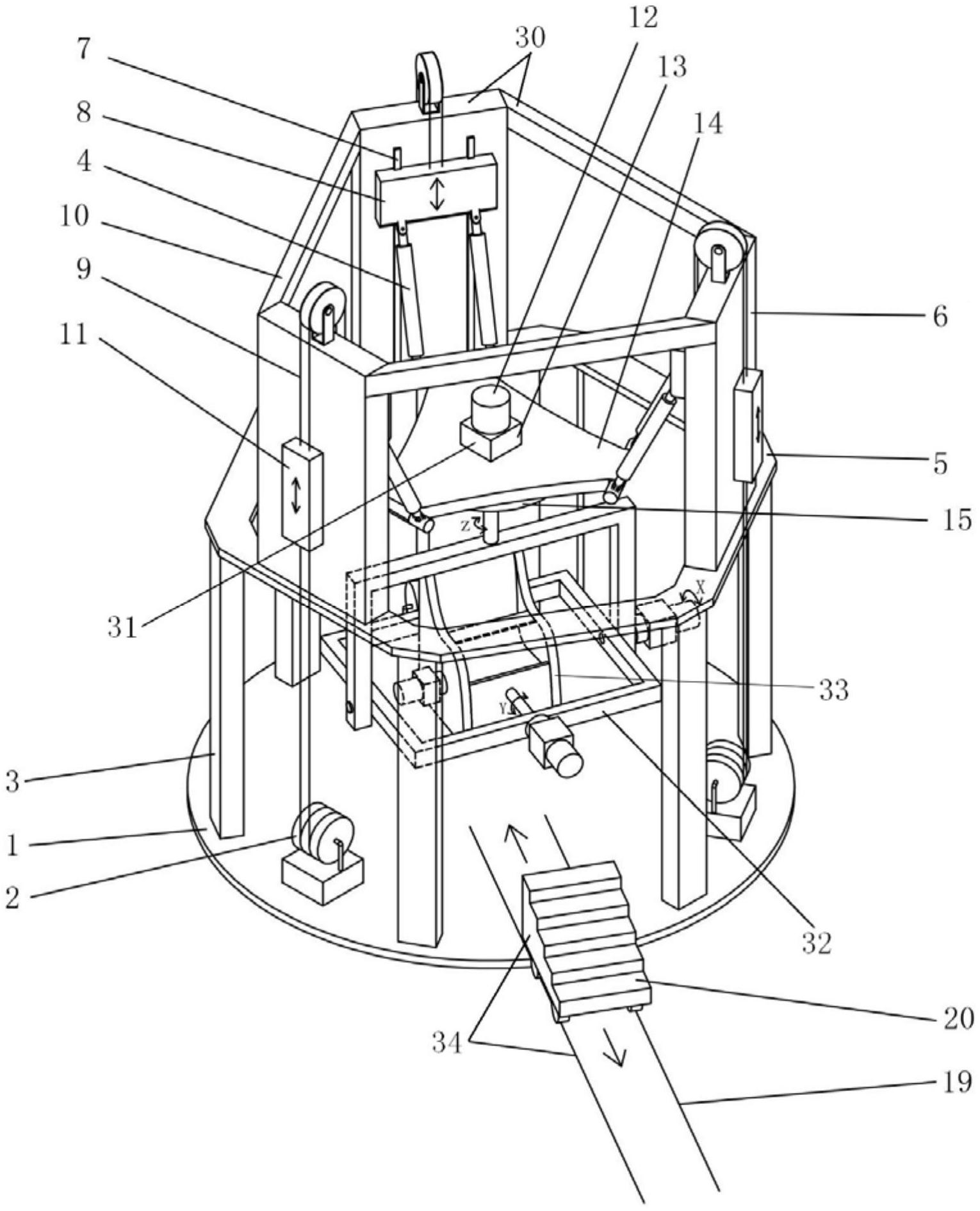 本发明公开了一种游乐设施虚拟体验试验装置,包括:基础底座、多向升降设备、悬挂平台、回转设备和旋转座舱设备;其中,基础底座上设置多向升降设备,悬挂平台悬挂设在多向升降设备的多向升降端,旋转座舱设备的顶部经回转设备与悬挂平台连接,悬挂设在悬挂平台的下面,多向升降设备能驱动悬挂平台和旋转座舱设备在基础底座上整体、单向或多向升降;回转设备能驱动旋转座舱设备在悬挂平台上回转运动;多向升降设备与回转设备能共同驱动使悬挂平台上的旋转座舱设备进行多自由度运动。该装置具有多个多自由度,能模拟多种游乐设施的运动,实现虚拟体验、人体生理参数试验、体验参数与效果的检测。