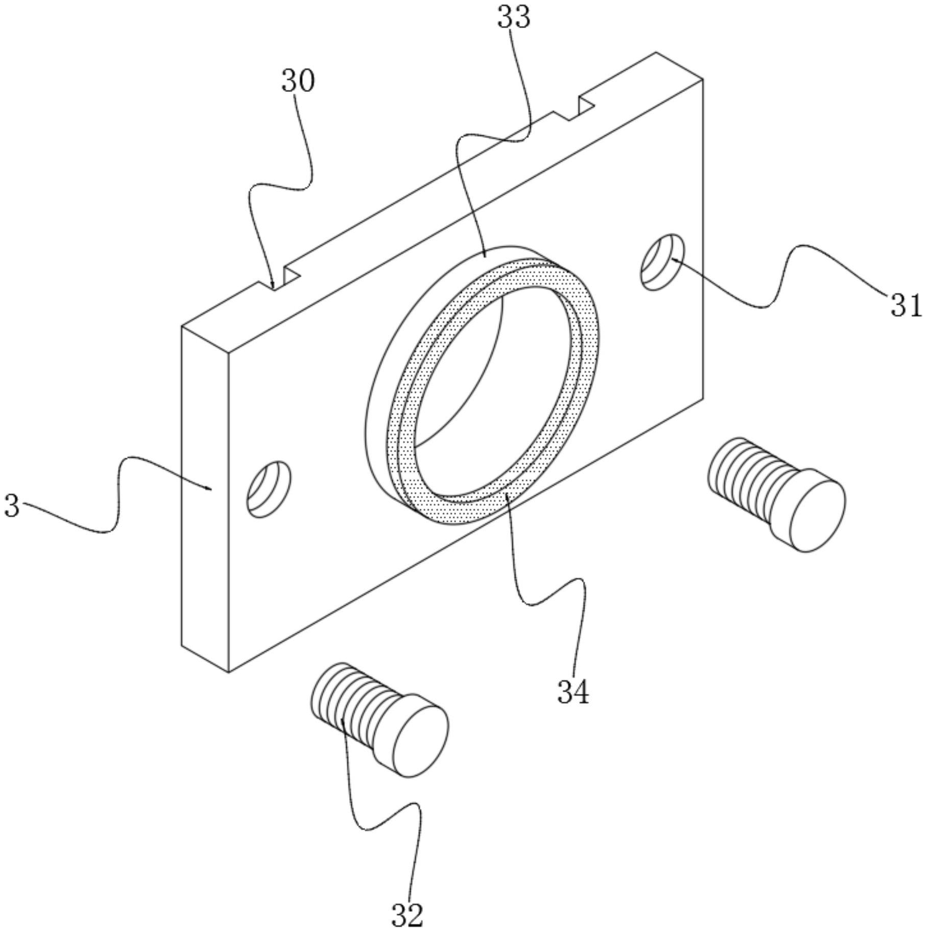 本实用新型涉及玻璃钢化炉技术领域,具体地说,涉及一种用于玻璃钢化炉的可调光眼固定装置,包括固定板,固定板的前侧壁上设有第一调节块,第一调节块的前侧壁上设有第二调节块,第二调节块的内部设有光眼,固定板的前侧壁靠近顶部和底部处均开设有滑槽,第一调节块的后侧壁靠近顶部和底部处均通过螺栓固定有滑块,滑块的尺寸与滑槽的尺寸相适配,且二者之间滑动连接,第一调节块的前侧壁靠近两侧处均设有凸块,第二调节块的后侧壁靠近两侧处均开设有凹槽;第二调节块的内部靠近中心位置处开设有圆孔,该用于玻璃钢化炉的可调光眼固定装置,便于根据观察的需求对光眼的位置进行调节,方便对光眼进行更换或维护。