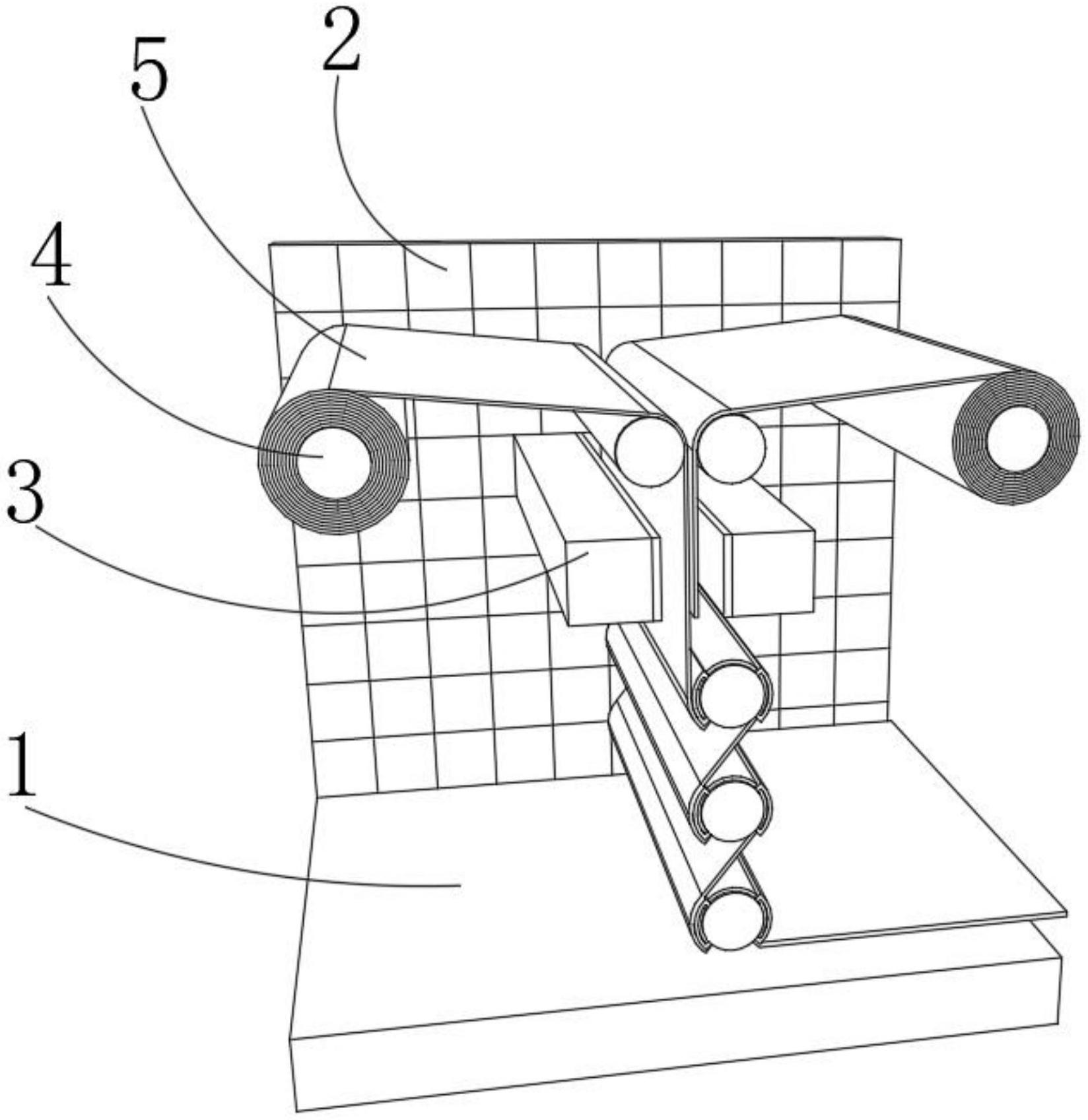 本实用新型提供纸板膜包一体机自动接膜机构,纸板膜包一体机自动接膜机构包括侧壁以及接膜组件,接膜组件设于侧壁一侧,机架一侧开设有凹槽,且机架一侧与伸缩柱相连接,伸缩柱一端设有电热板,且电热板与伸缩柱固定连接。本实用新型通过启动接膜组件,使伸缩柱向内施压,并通过电热板的加热,使第一卷膜与第二卷膜热接,从而完成接膜,接膜过程中,接膜组件下方的第一缓冲轴、第二缓冲轴以及第三缓冲轴分别通过连接的电动机进行转动,从而释放部分缠绕在第一缓冲架、第二缓冲架以及第三缓冲架侧表面的卷膜,以避免卷膜在热接时被后续的生产设备拉断,一定程度上也提高了设备的安全性,并达到了无需停机便可接膜的效果。