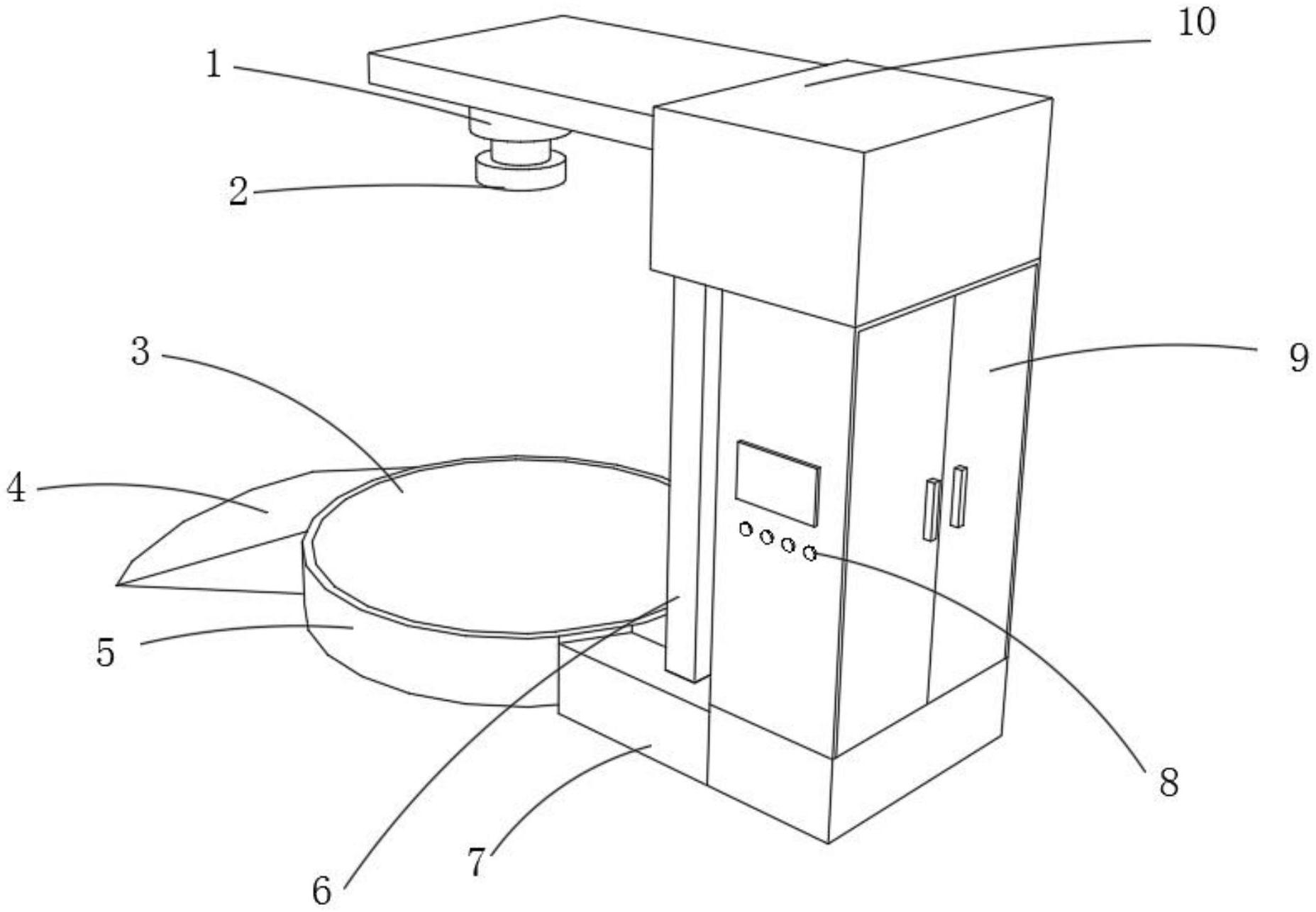 本实用新型提供可变频调速的裹箱机。所述可变频调速的裹箱机包括箱体、第二转盘以及包裹机构,箱体外表面设置有操控按钮、连接管、液压装置以及直流脉冲离子棒,其中箱体上直流脉冲离子棒的一侧开设有通孔。本实用新型提供的可变频调速的裹箱机,在具体实施时,通过新增操控按钮、齿轮卡槽、变频电机以及第二转盘相互配合,当箱子过高时,可以通过调节操控按钮上对应按键,使限位电机工作,进而使得保护框沿着齿轮卡槽上下移动完成对箱子的包裹,也可以通过操控按钮对变频电机的功率进行调节,进而加快第二转盘的转速,从而提高箱子的包裹效率,一定程度上解决了,不能调节裹箱子的速度,进而影响整体的包裹效率的问题。