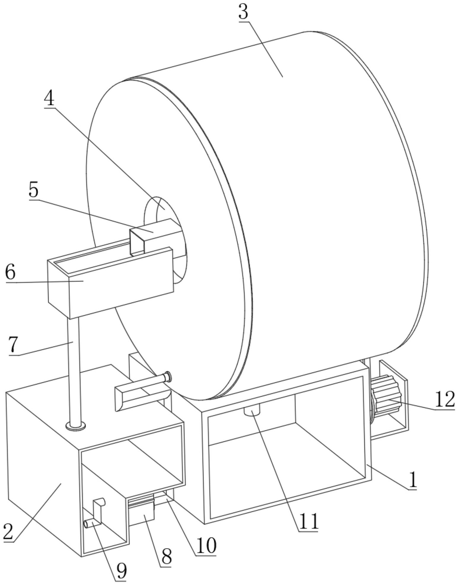 本实用新型公开了一种卧式刮刀离心机的残余滤饼层去除组件,包括过滤环和嵌入主管,过滤环内部的上端设置有传动连接轴;嵌入主管的外部设置有过滤腔,嵌入主管与过滤环之间横向均匀分布有若干个嵌入分流管,嵌入主管的一端设置有第二传输管道,第二传输管道的一端设置有抽液泵,抽液泵的一端设置有第一传输管道。本实用新型由抽液泵主动抽取储存于净水储存框内的液体,液体会直接接触过滤通孔过滤并滞留形成的滤饼,软化滤饼可有助于去除片接触并去除滤饼,解决了现有滤饼清除卧式刮刀对于滤饼去除组件伤害较大的问题。