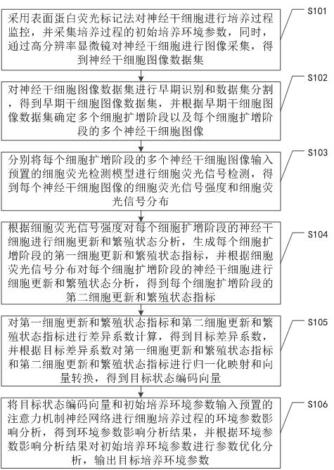 本发明涉及图像识别领域,公开了一种神经干细胞培养的早期识别方法及系统,用于提高神经干细胞培养的早期识别的准确率并实现细胞培养环境参数的自适应优化。方法包括:对神经干细胞进行培养过程监控,得到神经干细胞图像数据集;进行早期识别和数据集分割,得到每个细胞扩增阶段的多个神经干细胞图像;通过细胞荧光检测模型进行细胞荧光信号检测,得到细胞荧光信号强度和细胞荧光信号分布;进行细胞更新和繁殖状态分析,生成第一细胞更新和繁殖状态指标和第二细胞更新和繁殖状态指标;进行差异系数计算和向量转换,得到目标状态编码向量;通过注意力机制神经网络进行细胞培养过程的环境参数影响分析和参数优化分析,输出目标培养环境参数。