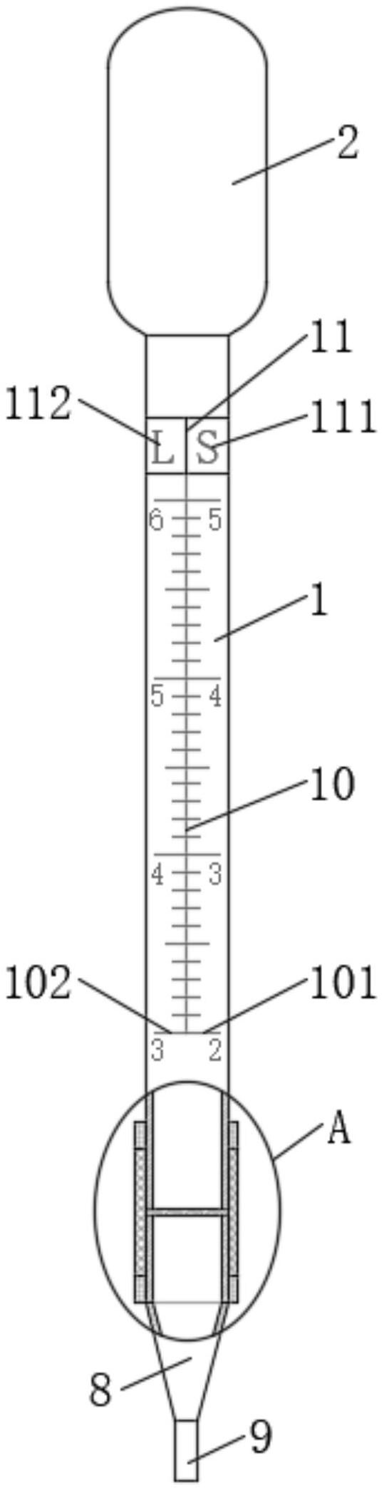 本实用新型公开了一种新型的巴氏吸管,属于液体和固体转移量取的辅助工具技术领域,一种新型的巴氏吸管,包括主管体,主管体上端固定连接有与其相连通的吸泡,主管体下侧设有与其相匹配的套管,套管内壁开设有内螺纹,套管内部固定连接有与其相匹配的滤膜,主管体外端开设有与内螺纹相匹配的第一外螺纹,且主管体下端延伸至套管内并通过第一外螺纹与套管螺纹连接,套管下侧设有与主管体相匹配的吸液直管,吸液直管外端开设有与内螺纹相匹配的第二外螺纹,可以同时满足液体转移和固体转移的使用需求,用途多样化,并且在固体转移过程中,可以方便工作人员有效排除多余液体的干扰,从而更加准确地读取固体的吸取量。