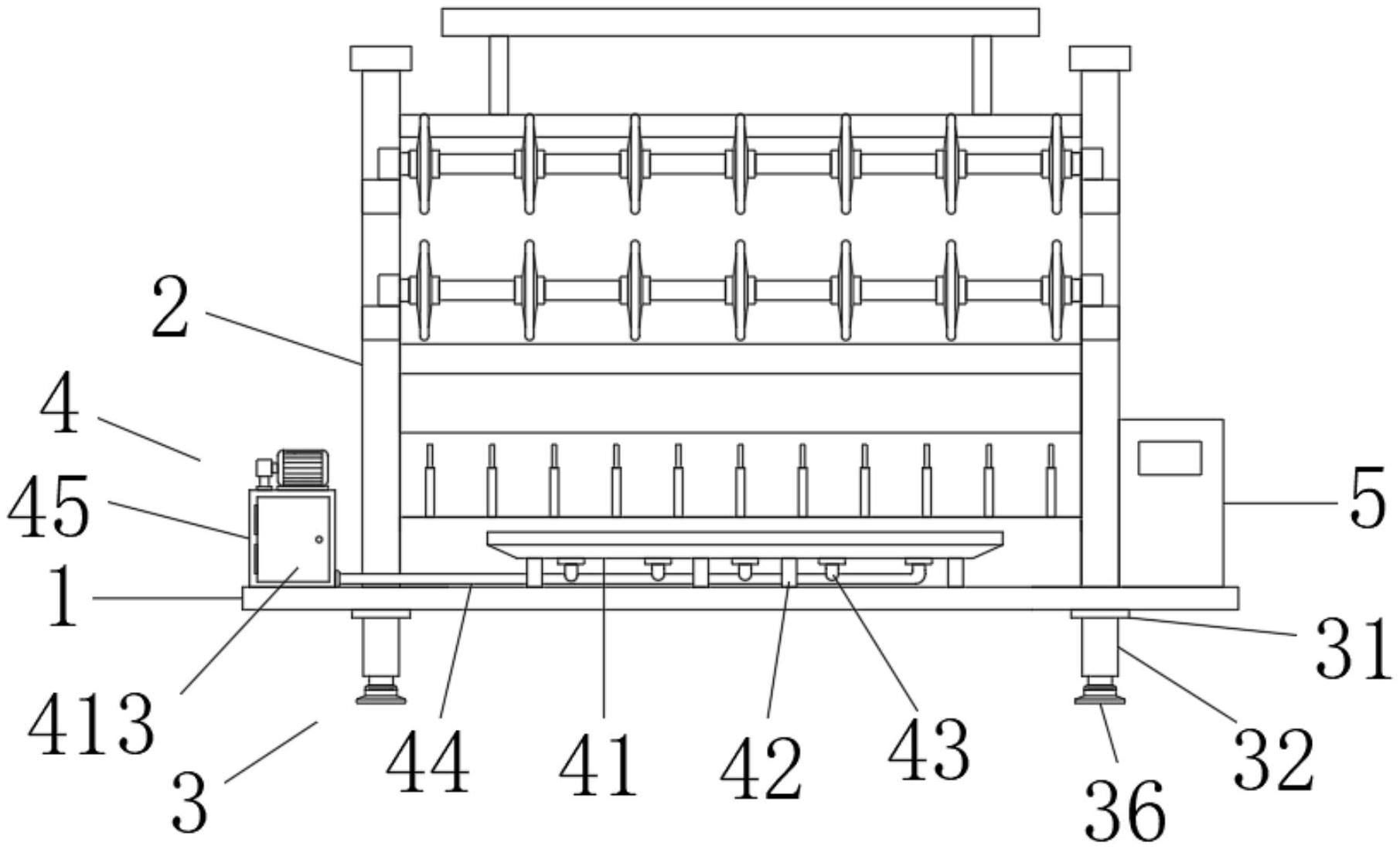 本实用新型公开了一种双贾卡提花装置,包括底板,所述底板的顶部固定安装有提花机本体,所述底板的底部四周均设有减震机构,所述底板的顶部设有除毛屑机构,所述底板的顶部且远离除毛屑机构的一端固定连接有电控箱,本实用新型所达到的有益效果是:本实用新型结构紧凑,实用性强,通过减震机构便于更好的对设备进行减震,从而对设备进行保护,通过除毛屑机构便于更好的将提花机本体运行时掉落的毛屑通过收集盒进行收集,通过滑动板便于更好的将滤网取出并对其进行清理,通过导线叶轮便于更好的引导气流向上移动,同时通过叶片上的梳齿便于对毛屑进行初步收集,防止大量毛屑粘连在滤网的底部,影响空气的流通。