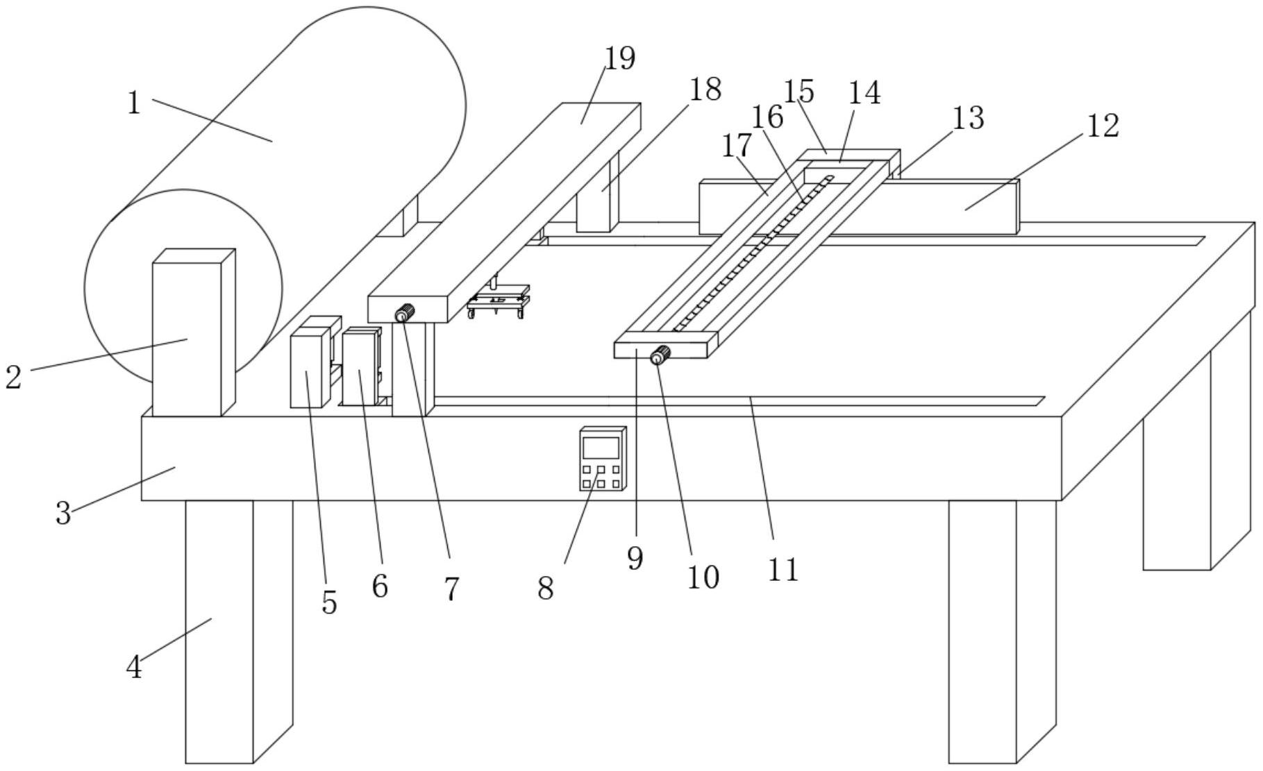 本实用新型公开了一种窗帘加工装置,包括支撑座,支撑座的顶部对称固定连接有支撑板,支撑板的一侧转动连接有放置辊,支撑座的顶部且位于支撑板的一侧对称固定连接有一号固定板,支撑座的顶部对称设有一号滑槽,一号滑槽的内部滑动连接有一号滑块,一号滑块的内部固定连接有三号电机;本实用新型所达到的有益效果是:通过设置了一号固定板、二号固定板、一号电动伸缩杆、二号电动伸缩杆、一号压紧块和二号压紧块实现了对窗帘布的压紧功能;通过设置了电机、转轴、齿轮、齿槽和一号滑块实现了对于窗帘布的移动功能;通过设置了一号丝杆、滑动块和推动板实现了对于裁切后的窗帘布的收集功能,自动化程度高,裁切效果好。