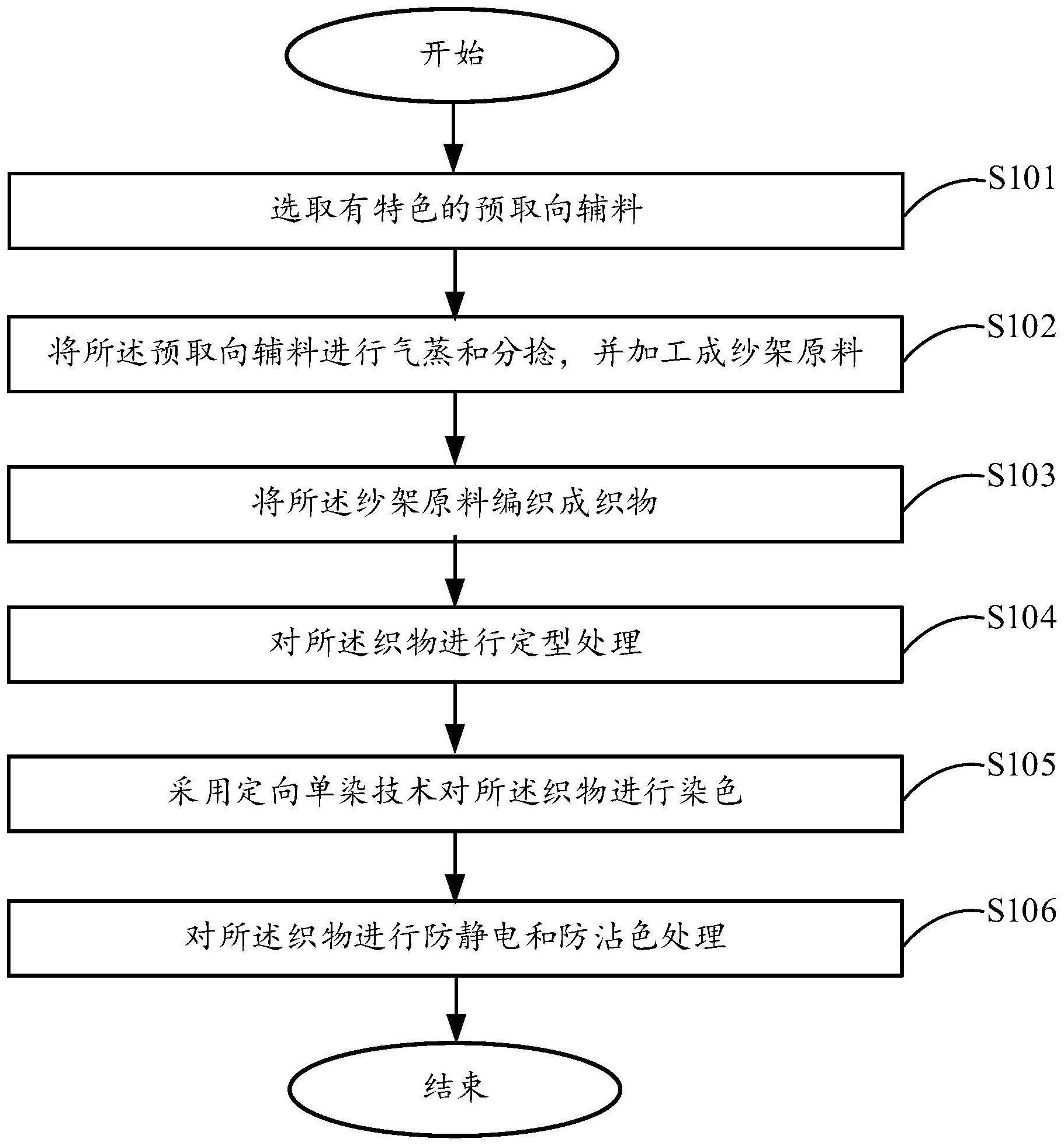 本发明公开了一种织物制造方法,属于纺织技术领域。织物制造方法包括:S101:选取预取向辅料;S102:将预取向辅料进行气蒸和分捻,并加工成纱架原料;S103:将纱架原料编织成织物;S104:对织物进行定型处理;S105:采用定向单染技术对织物进行染色;S106:对织物进行防静电和防沾色处理。可以根据实际情况选取有特色的辅料,大大降低生产原料选择的局限性,将诸多有特色的原料应用到生产中。将辅料进行气蒸和分捻,并加工成纱架原料,气蒸处理可以防止静电的产生,同时具有抗菌效果。之后将纱架原料编织成织物,后续进行定型处理、染色处理、防静电处理和防沾色处理,使得成品织物富有立体凹凸感。
