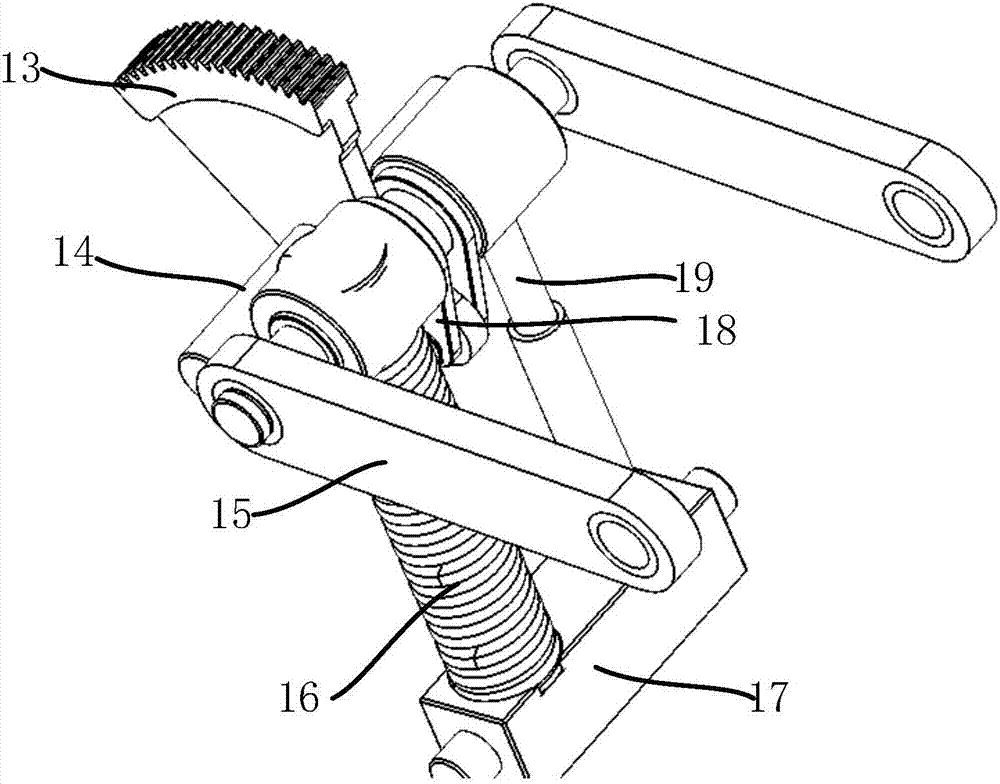 本实用新型提供了一种用于电梯安全防护的夹绳器装置,包括夹绳器支撑装置、传动齿轮组件、扇形压板、蓄能弹簧、第一转轴、第二转轴、传动臂、动夹板、定夹板以及导向支承轴;扇形压板设置在第一转轴上,第一转轴设置在夹绳器支撑装置的两侧支撑板上;夹绳器支撑装置的两侧支撑板上设置有弧形导槽;第二转轴的两端设置在弧形导槽内,扇形压板带动第二转轴在弧形导槽内滑动;蓄能弹簧的上端与第二转轴相连,第二转轴与传动臂的一端部铰接,传动臂的另一端部与动夹板铰接,导向支承轴的一端部连接夹绳器支撑装置的前支撑板,动夹板设置在导向支承轴上。本实用新型能够提高动夹板和定夹板在水平方向的夹紧力,能够适用于载重2吨以下的电梯。