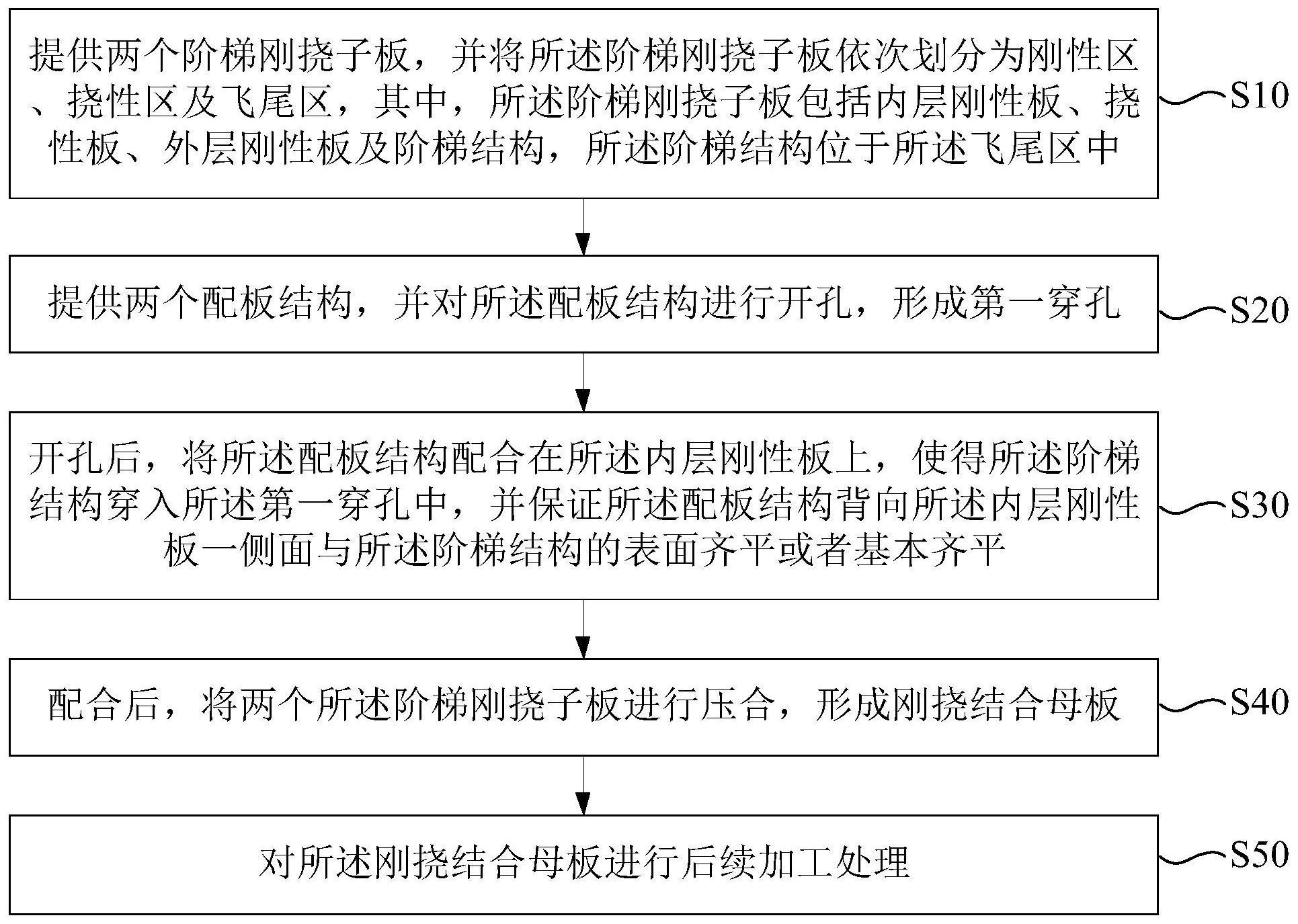 本发明公开了一种飞尾阶梯结构刚挠结合板及制作方法,首先提供两个阶梯刚挠子板;再提供两个配板结构,将配板结构配合在内层刚性板上。由于配板结构上设有第一穿孔,因此,当配板结构配合在内层刚性板上时,阶梯结构从第一穿孔伸出,如此,有效避免阶梯刚挠子板在压合过程中,配板结构对阶梯结构造成干涉。又由于配板结构背向内层刚性板的一侧面与阶梯结构表面齐平或者基本齐平,因此,通过配板结构填补了阶梯结构与内层刚性板之间的高度差,使得阶梯刚挠子板在压合过程中,受压均匀,从而有效解决阶梯刚挠子板压合时出现失压分层问题,使得飞尾阶梯结构刚挠结合板的成品率得到保障。