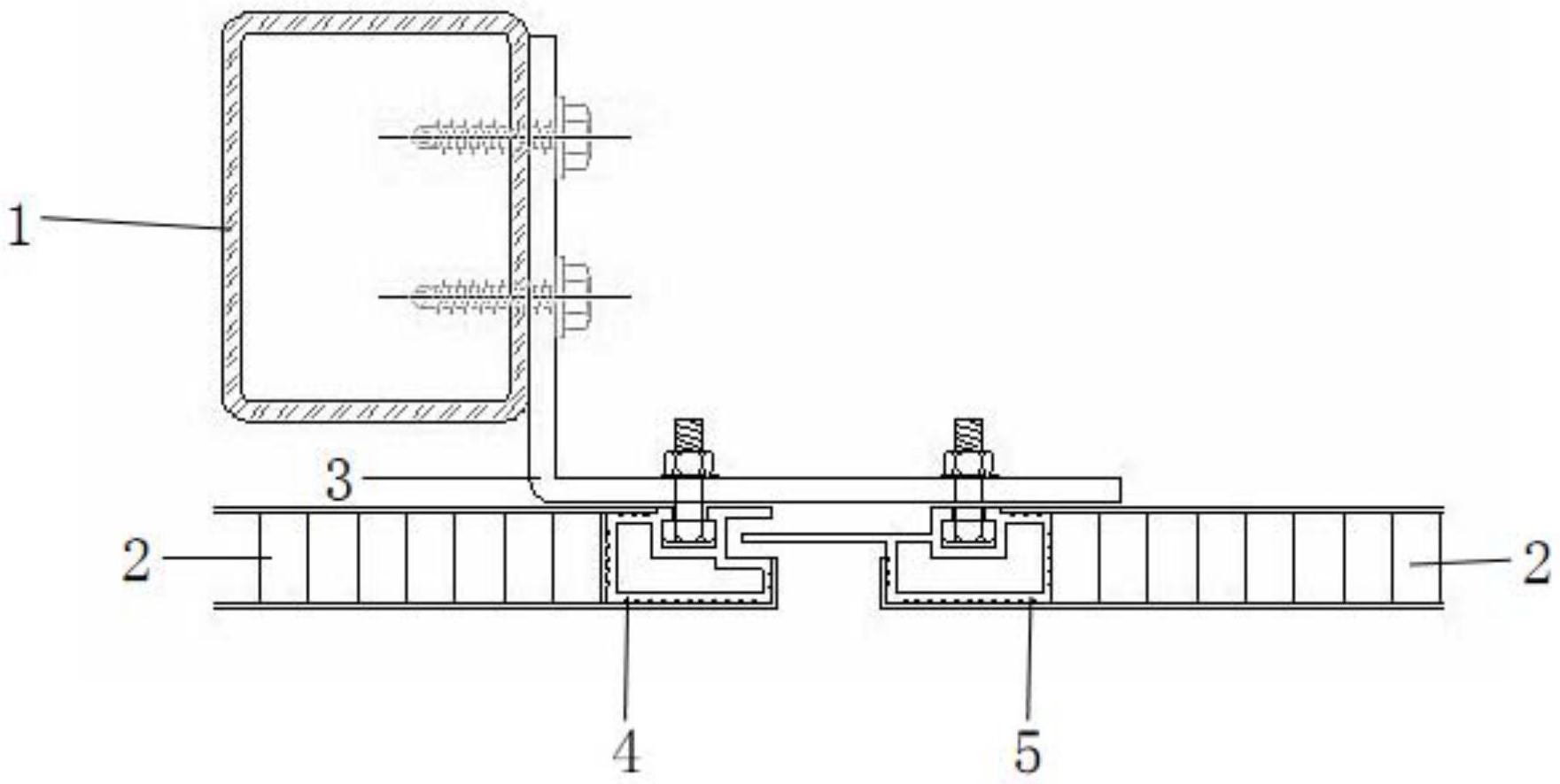 本实用新型公开了一种金属复合板的安装结构,包括钢架基层、一对金属复合板、第一金属边框、第二金属边框和连接件。连接件包括互相垂直的竖向连接部和横向连接部,竖向连接部与钢架基层连接,横向连接部通过第一金属边框、第二金属边框与一对金属复合板连接;第一金属边框上部开设有第一孔槽、右侧开设有一凹槽;第二金属边框上部设有第二孔槽,第二孔槽的左侧设有一金属板延伸向凹槽;第一孔槽和第二孔槽供高强螺栓插入;所述高强螺栓由高强螺母在横向连接部上固定。本实用新型可以实现方便和准确安装金属复合板,使金属复合板牢固安装且位于同一水平面。