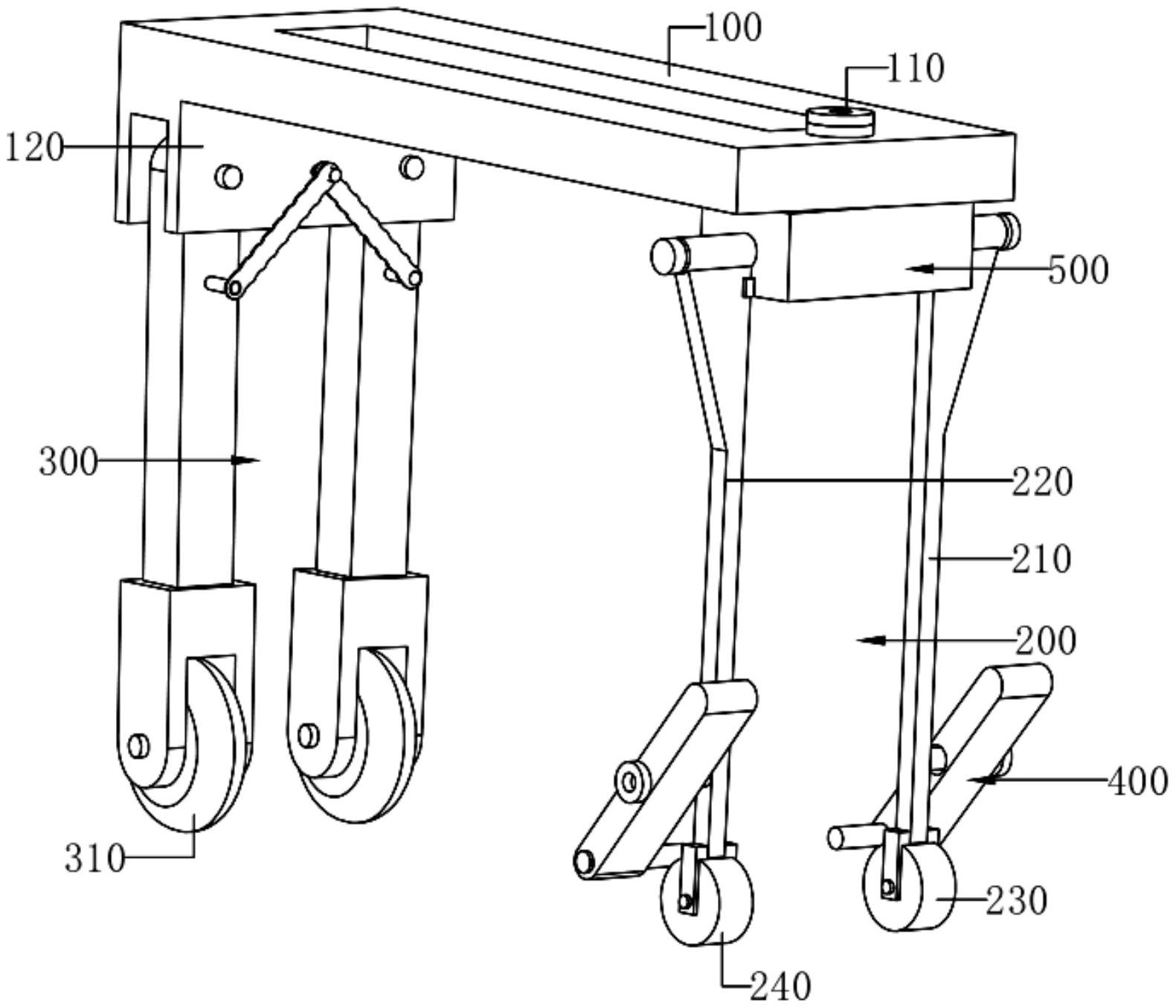 本实用新型涉及一种异步式行走装置,属于移动装置技术领域,包括机架,在所述机架长度方向一端设置有前腿机构,另一端设置有后腿机构,所述前腿机构包括转动设置于所述机架宽度方向一侧的左前腿、和转动设置于所述机架宽度方向另一侧的右前腿,在所述左前腿的下端连接有第一单向轮,所述右前腿的下端连接有第二单向轮;所述左前腿和右前腿上设置有驱动机构,所述驱动机构控制所述左前腿和/或右前腿向前转动,或控制所述第一单向轮和/或第二单向轮静止。本方案通过驱动机构可以控制前腿机构交替向前行走,且该装置结构简洁,加工成本相对较低,装配、调整、维护、移动时相对方便。