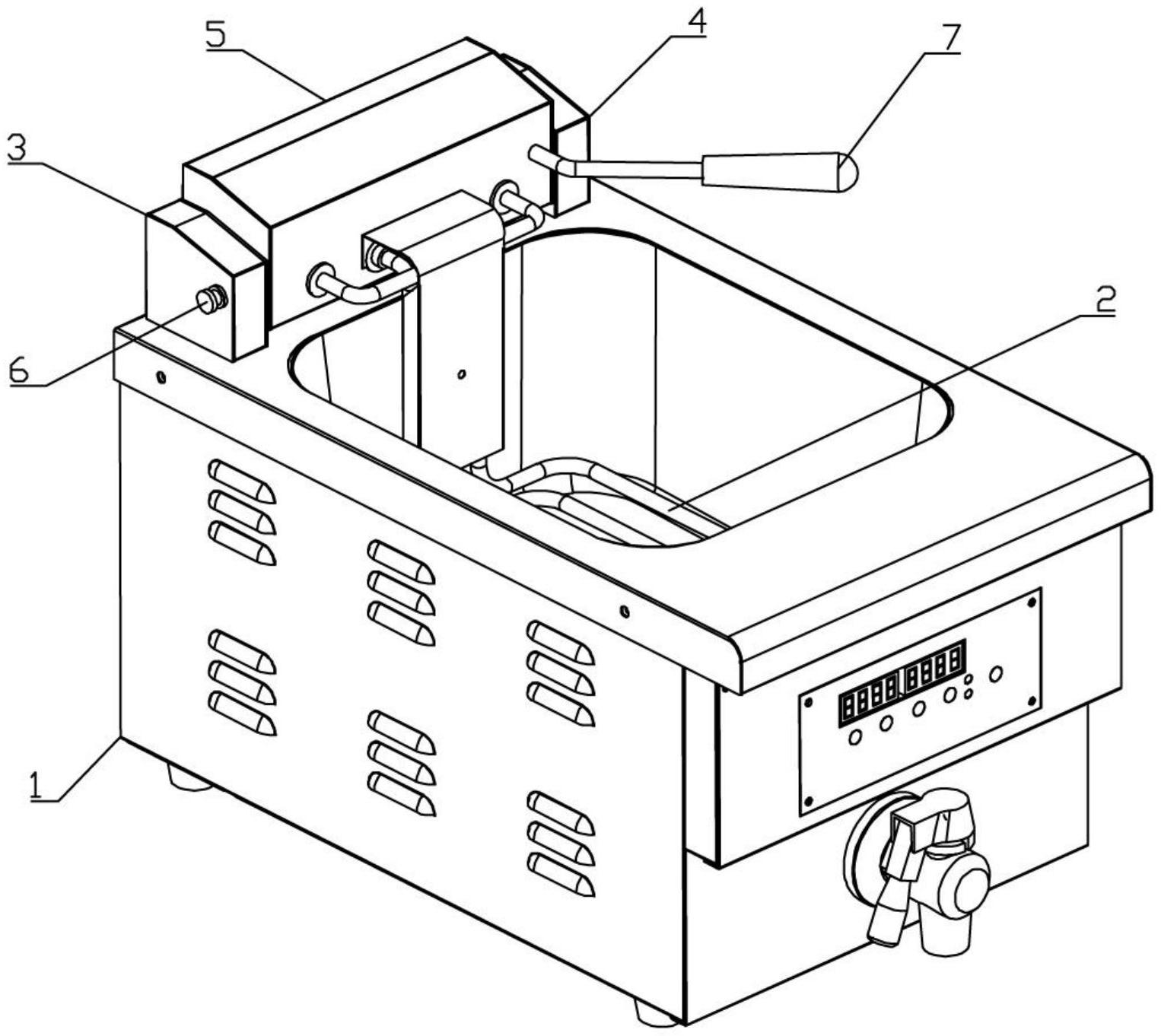 本实用新型公开了一种便于清理发热管油污的电炸炉,包括箱体,箱体通过向下的凹陷形成油缸,箱体的上表面固定连接间隔一定距离的左机头转座和右机头转座,左机头转座和右机头转座之间转动连接机头,机头连接抬杆和发热管,工作姿态时的发热管伸入油缸,左机头转座连接姿态锁定结构,姿态锁定结构的端头向右伸出左机头转座并抵拢机头的侧壁;姿态锁定结构设有弹性元件,机头面向左机头转座的一侧设有与姿态锁定结构匹配的锁孔,锁孔跟随机头的运动轨迹经过姿态锁定结构。