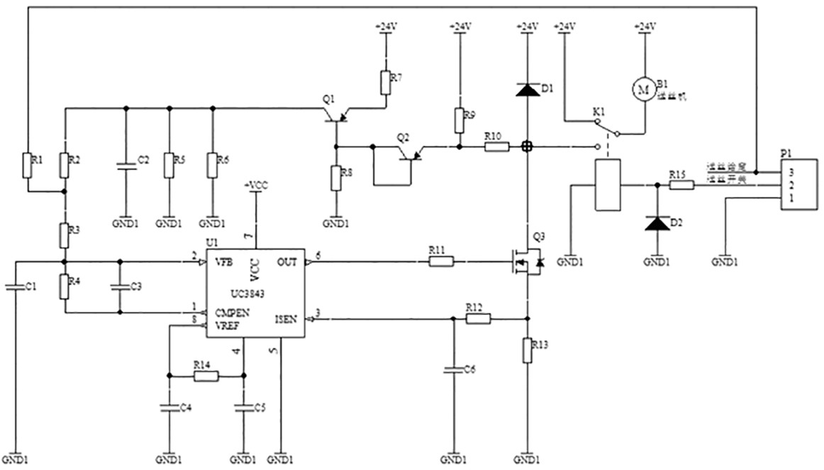 本实用新型公开了一种气保焊送丝控制电路,包括送丝给定电路、送丝脉宽调制电路、速度反馈电路、功率驱动电路、过流检测电路、送丝机开关控制电路和其它辅助电路,所述送丝给定电路包括插件P1、电阻R1、电阻R3和脉宽控制集成电路U1。本实用新型结构简单;通过送丝机开关控制电路由继电器K1的常开、常闭控制,这个状态是互斥的,送丝机B1送丝开状态和刹车不能同存在,必免了逻辑错误,大大提高了送丝电路的可靠性;保护电路完整,且成本更低。