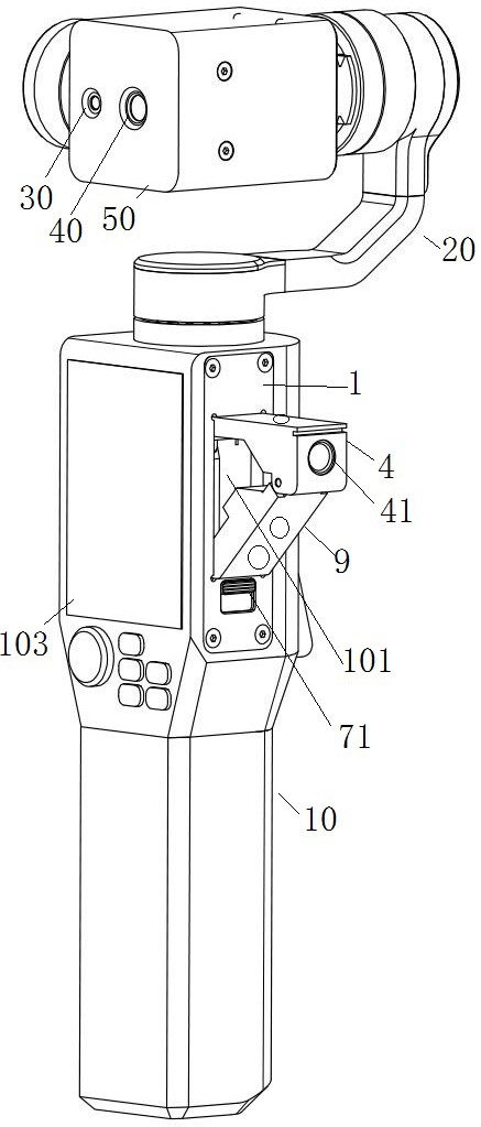 本实用新型涉及摄影器材技术领域,具体涉及一种可收纳的扩展口装置,包括手柄部,所述手柄部具有一安装空间,所述安装空间内设有旋转座、旋转支撑架和扩展接口座,所述旋转座与所述扩展接口座转动连接,所述扩展口座与所述旋转支撑架转动连接,所述旋转支撑架与所述所述旋转座滑动连接,所述扩展接口座的表面具有扩展口。解决了现有的扩展口不能突出于云台本体展开,且不能收纳于云台本体的问题。