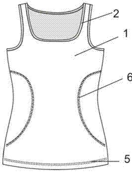 本实用新型公开了一种蚕丝针织背心,包括里料、内覆层、蚕丝层、面料组成,所述的内覆层和蚕丝层是放置在前内片与后内片的上面,并采用撬边机点式暗缝,然后与面料、里料缝合在一起,所述的贴蚕丝层处用高弹加密网线固定,袖窿贴边、领口裹边均为1.2cm缝合,下摆折边用双明线缝合。本实用新型款式简约、轻薄,蚕丝保暖贴身、轻易舒适、绿色健康、亲肤防敏、吸湿透气、无静电,适用人群广泛,产品投放市场后深受消费者青睐,市场潜力巨大。