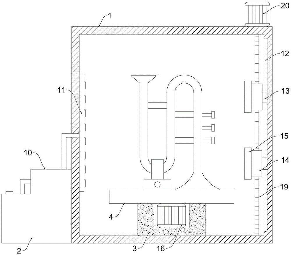 本实用新型公开了一种金属管乐的表面消毒装置,包括消毒箱和设置在消毒箱一侧的储液箱,消毒箱内腔的底端固定设置有辅助台,辅助台的顶端固定设置有放置板,放置板顶端的一侧开设有放置槽,放置板顶端的另一侧固定设置有固定块。本实用新型一种金属管乐的表面消毒装置,把金属管乐的管头部分置于放置槽内,再把管部置于两个限位板之间,拧动旋拧套带动螺纹杆转动,螺纹杆移动并推动限位板进行移动,进而通过两个限位板,实现对金属管乐进行夹紧,在通过弹性带对金属管进行进一步绑定,通过鼓风机对金属管乐表面的灰尘进行吹除,然后再通过水泵向喷洒管内鼓入酒精,喷向金属管乐的表面,实现对金属管乐进行消毒,不需要人工进行操作,省时省力。