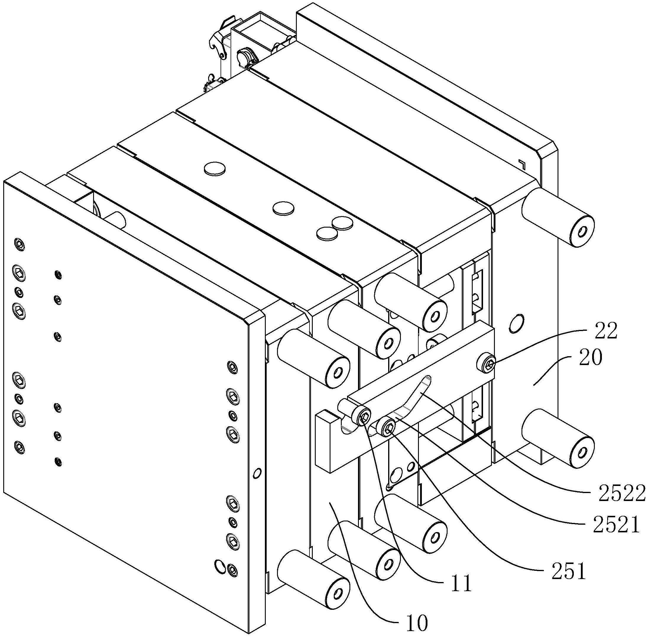 本实用新型公开了一种模具结构以及应用该结构的倒装模具,其中模具结构包括沿左右方向依次设置的动模组和定模组,动模组沿左右方向往复运动,动模组和定模组之间设有合模空间,定模组上滑动连接有顶出组件,顶出组件沿左右方向往复滑动,顶出组件通过转轴连接有卡扣,动模组上设有适配卡扣的卡接块,卡扣上设有调节机构,定模组联动连接调节机构从而调节卡扣绕转轴摆动的位置,卡接块的运动轨迹与卡扣的运动轨迹相交,顶出组件的运动轨迹与合模空间相交。本实用新型还提供了一种采用上述模具结构的倒装模具。本实用新型提供一种由机械传动而带动顶针顶出的模具结构及倒装模具,避免直接采用驱动装置带动顶针顶出。