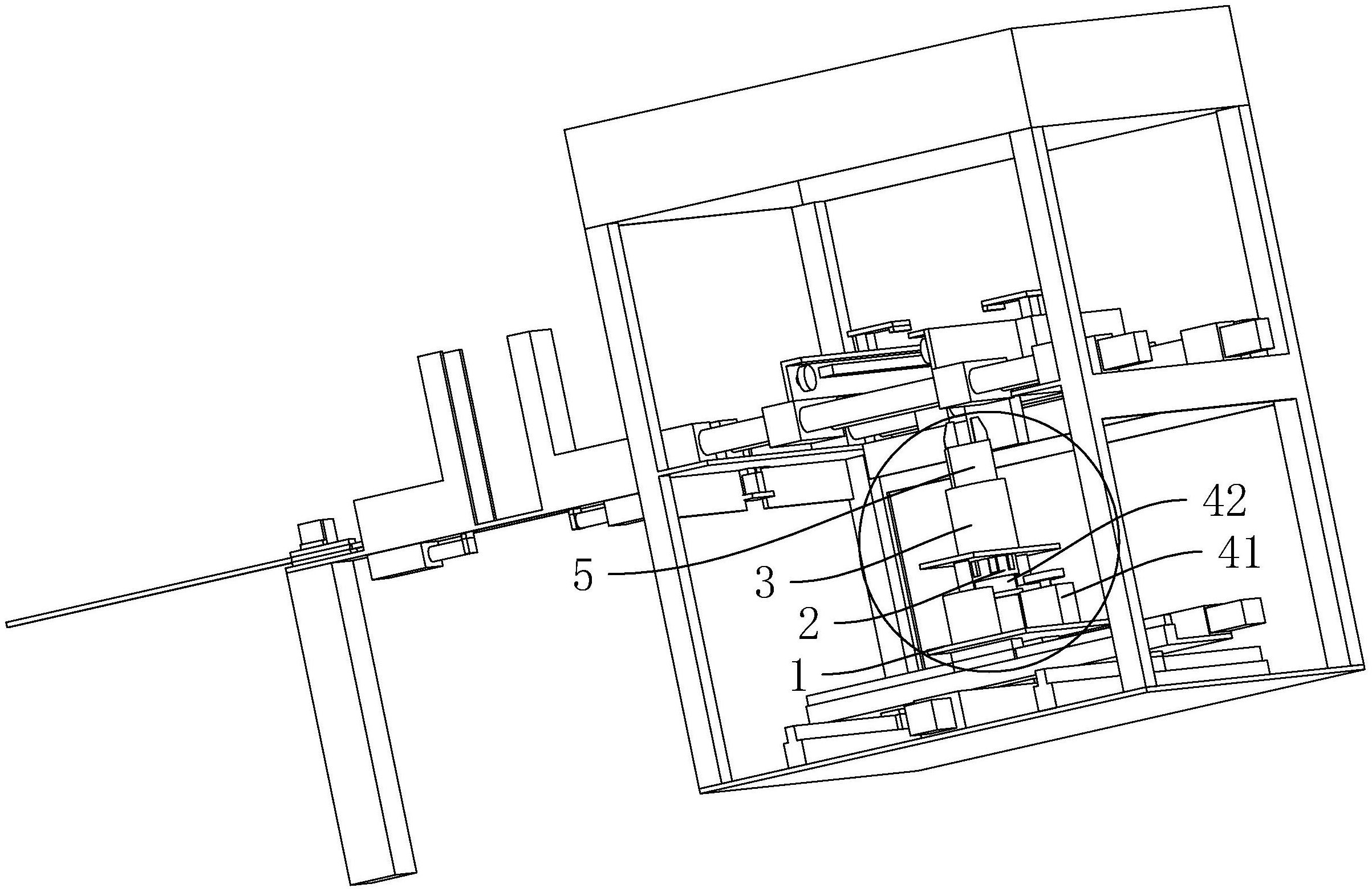 本实用新型公开一种引脚固定装置,包括机架,还包括轴体、滑块,所述轴体沿竖向设置,所述轴体设置在所述机架上,所述滑块上开设有沿上下方向的盲孔,所述盲孔滑动连接所述轴体,所述滑块上设有夹紧装置,所述机架上设有升降装置,所述升降装置带动所述滑块上下运动,所述机架上设有电机,所述电机带动所述滑块旋转运动,所述滑块的转动轴线沿上下方向设置,所述夹紧装置上设有夹具,所述夹紧装置带动所述夹具开合运动,所述夹具用于夹紧引脚。本实用新型提供一种能够使插件到电路板上的电器元件与电路板之间相对固定的引脚固定装置。