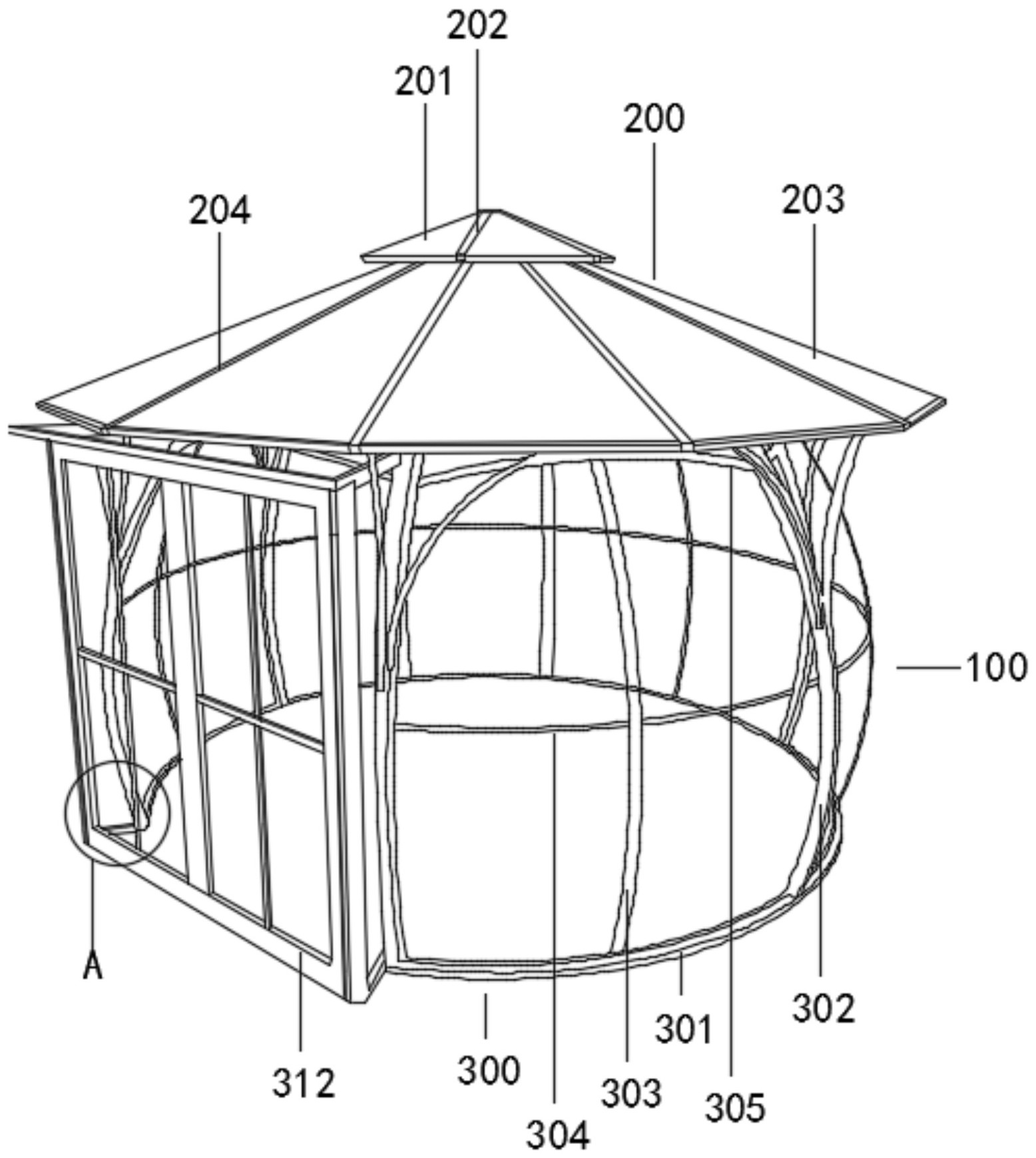 本实用新型公开的属于技术领域,具体为一种多功能圆形封闭式阳光房,其技术方案是:包括阳光房本体,所述阳光房本体包括伞体组件、骨架组件和遮盖组件,所述伞体组件包括伞圈,所述伞圈外壁固定连接第一伞架,所述第一伞架上固定连接伞布,所述伞布顶部固定连接第二伞架,所述伞架上焊接连接块一,所述连接块一上开设有内螺纹孔一,所述第一伞架端固定连接伞头,本实用新型的有益效果是:通过设置玻璃层一和玻璃层二,在玻璃层一和玻璃层二设置空心区域,并将空心区域抽成真空状态,使得阳光房本体的隔音效果好;防爆玻璃一和爆玻璃二表面贴的玻璃隔热膜,有效的提高了阳光房本体的隔热性能。
