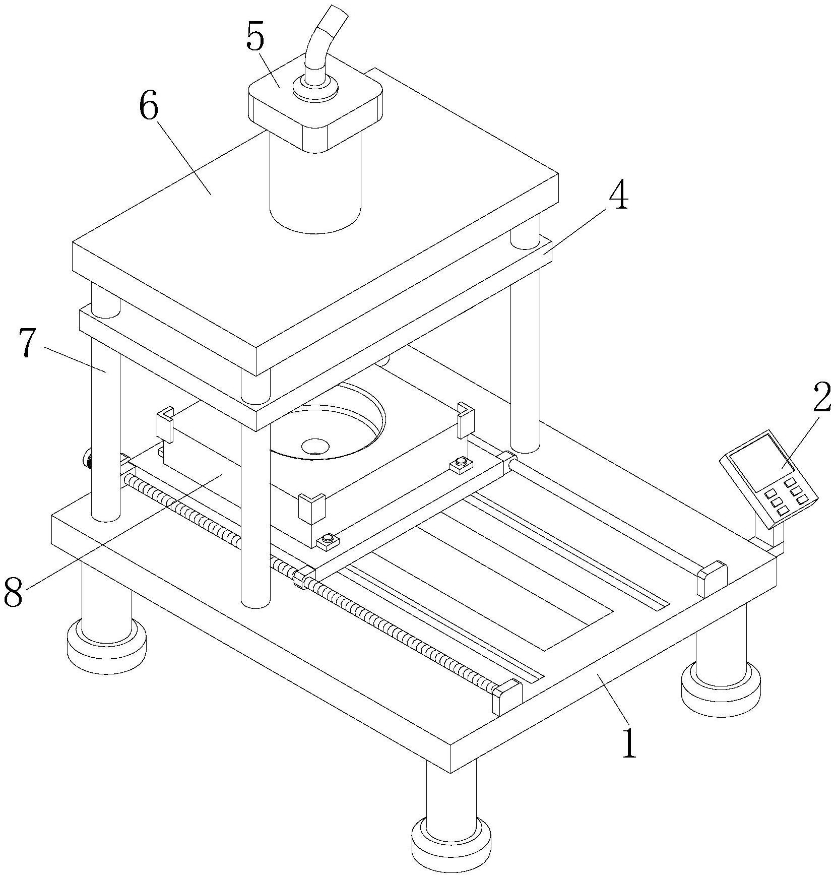 本实用新型公开了一种景泰蓝锅生产用冲压模具,包括底座机构,所述底座机构顶部的后侧焊接有导向柱,所述顶板的顶部通过螺栓贯穿连接有液压推杆,所述液压推杆的底部通过螺栓连接有安装板,所述安装板的底部通过螺栓连接有上模具,所述底座机构的顶部通过螺栓连接有下模具机构。本实用新型通过控制器、上模具、安装板、液压推杆、顶板、安装开口、底座板、丝杆、驱动电机、限位板、第一贯穿孔、下模具、安装竖板、导向滑杆、安装底板、第二贯穿孔、安装架和电动推杆的配合使用,具备下模具可以移动,方便进行上料,防护性更高,避免人员误操作使上模具挤压到人员手部,同时方便把成型锅体从下模具内取出的优点。