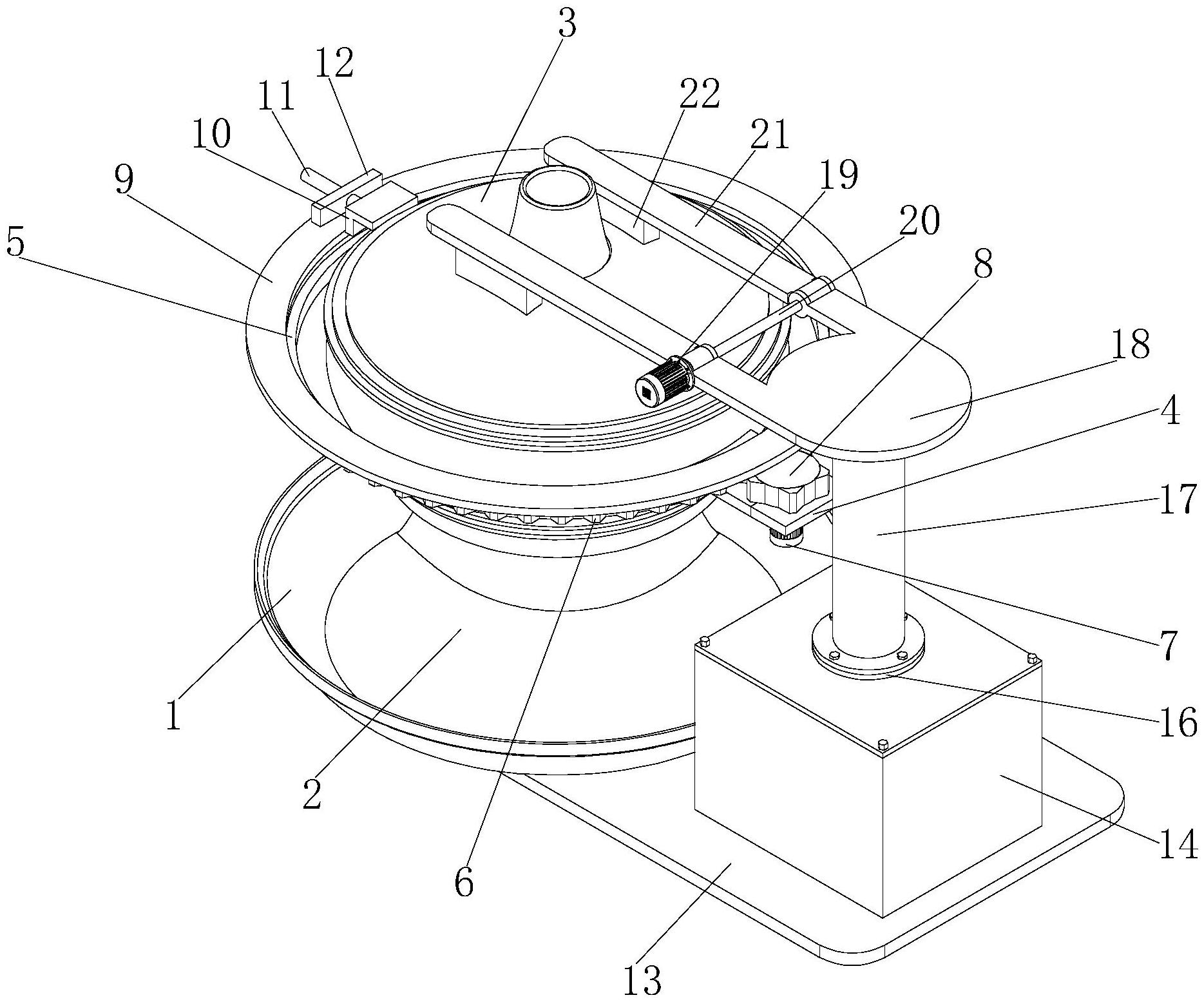 本实用新型公开了一种具有防烫伤功能的景泰蓝锅,包括托盘,所述托盘内腔的底部设置有景泰蓝火锅主体,所述景泰蓝火锅主体的顶部罩设有锅盖。本实用新型通过安装板、固定套、齿环、第一伺服电机、齿轮、安装环板、擦油板、第一电动伸缩杆、固定板、第二伺服电机、转板、第二电动伸缩杆、转动板、锥形转子电机、转杆、带动板和连接块的配合使用,具备自动开盖和对锅边擦油的优点,解决了现有的景泰蓝火锅在烧水时通常都需要将锅盖盖上,在锅中水烧开时,需要人工将锅盖拿起,锅盖较烫可能会将使用者烫伤,不具备对锅边进行擦拭,锅边可能会落有大量火锅油,火锅油若沾染到衣服上不便于吸取的问题。