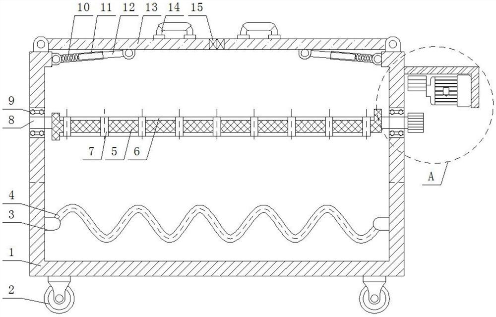 本实用新型公开一种烧饼自动烘烤机,包括底箱,底箱内设置有支撑板,支撑板顶面、底面皆固设有粘接板,两块粘接板与支撑板上均匀开设有若干透气孔,底箱左侧板、右侧板上均开设有椭圆孔,每个椭圆孔内均设置有轴承座,每个轴承座内皆安装有轴承,位于每个椭圆孔两侧皆开设有一对滑槽,每个滑槽内均滑动连接有滑块,两块滑块相对的一端皆与轴承座的两侧固接,底箱左侧板、右侧板内皆安装有电推缸,每个电推缸的延伸端皆与轴承座的底端固接,每个轴承内均设置有连接组件,底箱右侧面上设置有啮合组件。本实用新型不仅可以对烤饼进行不同高度位置的烘烤,而且有效解决了工作人员需要手动将烧饼进行翻动,避免了给操作人带来烫伤的危险。