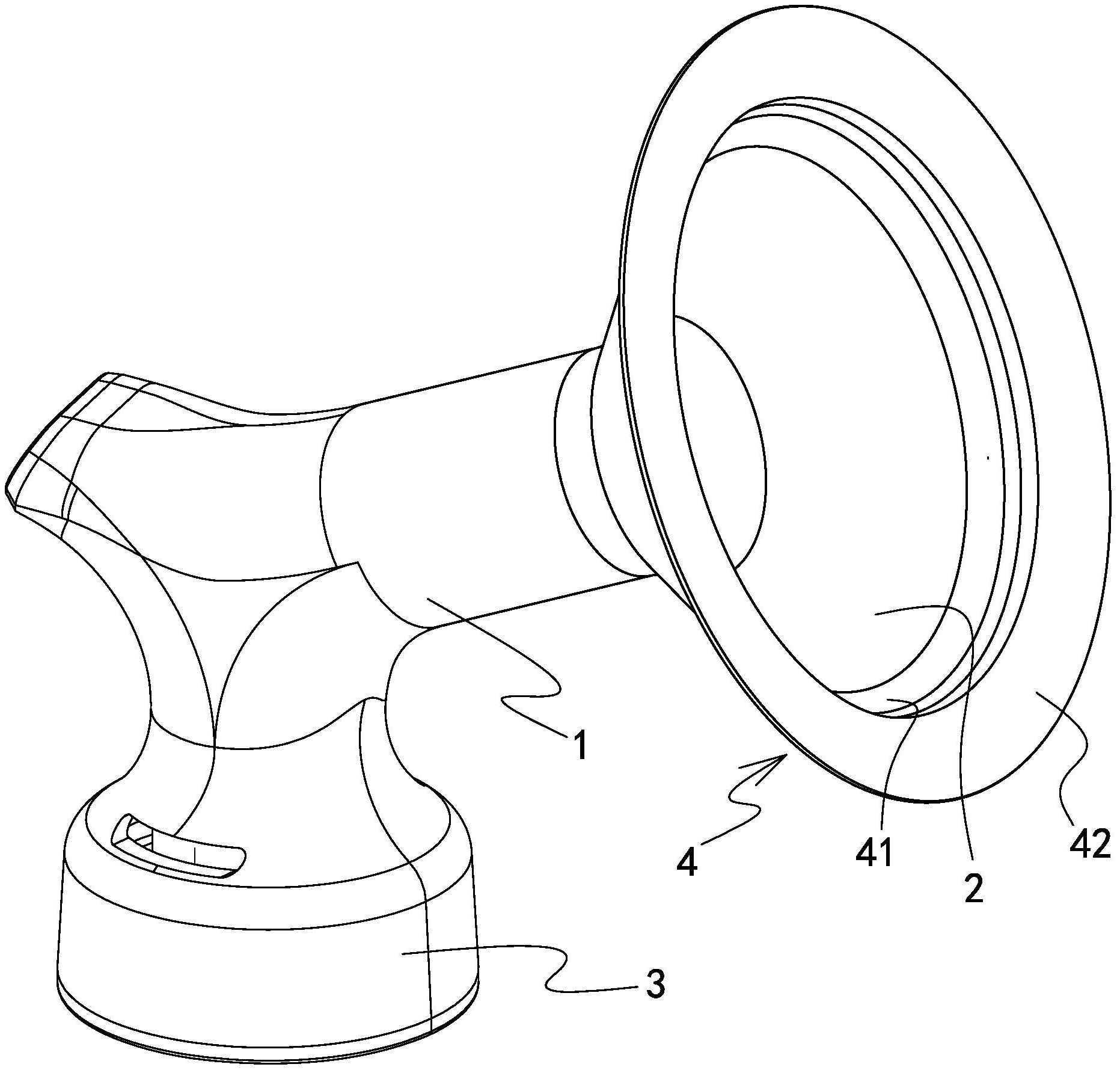 本实用新型公开了一种吸奶器罩盖,属于吸奶器技术领域。本吸奶器罩盖解决了原有吸奶器清洗麻烦的问题。本吸奶器罩盖包括本体、位于本体上侧的扩口部和位于本体下侧且用于连接奶瓶的连接部,本体、扩口部和连接部为一体式结构,扩口部上具有喇叭状的贴靠部,贴靠部与扩口部为一体式结构。由于扩口部与贴靠部之间为一体式结构,因此清洗时,贴靠部无需拆卸,方便清洗,用户使用更卫生。