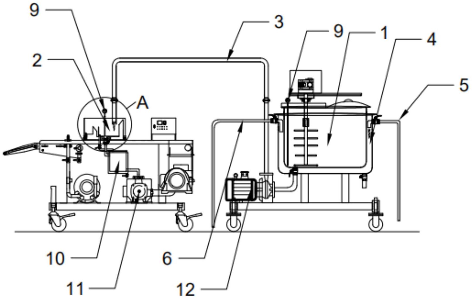 本实用新型公开了一种食品浆料保温循环装置,属于食品生产设备技术领域,包括搅拌槽、浆料槽以及冰水制冷循环系统,所述冰水制冷循环系统包括制冷装置以及冰水循环桶,所述制冷装置包括制冷机以及冷却塔,所述冰水循环桶套设在所述搅拌槽外侧,所述冰水循环桶两侧分别设有与制冷装置连接的进水管以及出水管,所述出水管穿过制冷机下部后连接所述冷却塔,所述冷却塔输出端连接制冷机输入端,所述制冷机输出端连接所述进水管,所述搅拌槽的底部固定连接有输料管,所述输料管另一端连接浆料槽,所述输料管中部设有输料泵,本实用新型具有保持浆料温度,使浆料不易损坏,缩短浆料周转时间,有效保证产品营养成分不流失的优点。