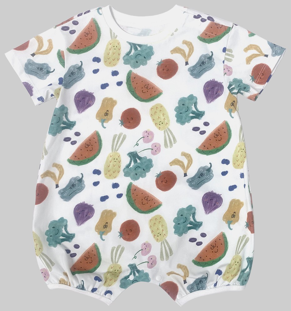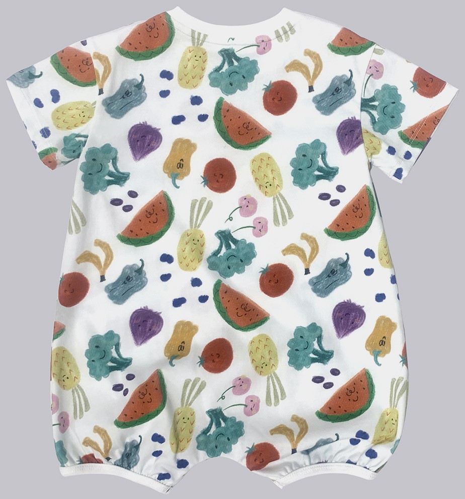 1.本外观设计产品的名称:童装(果蔬认知满版)。2.本外观设计产品的用途:本外观设计产品用于儿童穿着衣物。3.本外观设计产品的设计要点:在于形状与图案的结合。4.最能表明设计要点的图片或照片:主视图。5.本外观设计产品为薄型产品,省略左视图、右视图、俯视图、仰视图。